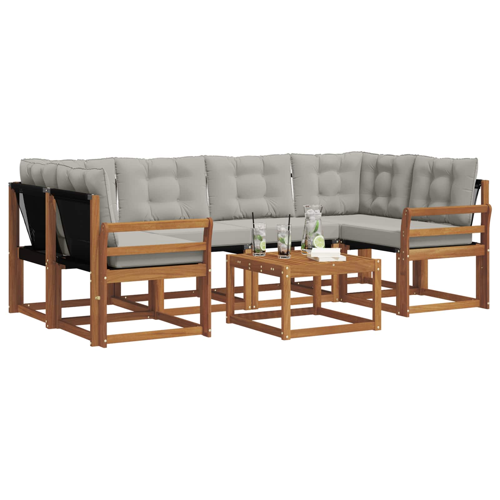 Dieses moderne Sofaset ist der Blickfang für jeden Außenbereich. Mit seinem schlanken, zeitgenössischen Design wertet es deinen Garten, deine Terrasse oder deinen Poolbereich auf. Es hat eine natürliche Holzoptik und unterstützt dich mit komfortablen Rückenlehnen und praktischen Armlehnen. Die erdigen Farbtöne fügen sich harmonisch in die Natur ein und schaffen eine einladende Atmosphäre für Treffen oder entspannte Momente. Elegante Materialkombination: Aus massivem Akazienholz und Textilene gefertigt, bringt dieses Sofaset eine schicke Holzoptik mit einer robusten Textilene-Sitzfläche. Die Materialien sind nicht nur modern, sondern sorgen auch für Langlebigkeit bei jedem Wetter und sind ein treuer Begleiter durch die Jahreszeiten. Umfassendes Komponentendesign: Mit Outdoorkissen und unterstützenden Rückenlehnen designed, ist jedes Teil des Sofasets für optimalen Komfort gemacht. Die praktischen Armlehnen und der Tisch mit Lamellen sorgen für einfache Entwässerung und machen das Set sowohl funktional als auch bequem für dein Entspannungserlebnis im Freien. Praktische Merkmale: Die UV-beständigen Eigenschaften schützen das Sofaset vor Sonnenschäden und halten die Farben lebhaft. Die abwischbaren Oberflächen machen die Pflege kinderleicht und halten das Set frisch und einladend für den täglichen Gebrauch – ideal für das Leben im Freien. Vielseitige Nutzungsmöglichkeiten: Geeignet für Garten, Terrasse, Hinterhof oder Pool, passt sich dieses Sofaset problemlos an verschiedene Außenbereiche an. Sein modernes Design ist die perfekte Ergänzung für Partys oder entspannende Tage an deinem eigenen Rückzugsort. Einfach Pflege: Mit einem durchdachten Design braucht dieses Sofaset nur wenig Pflege – einfach mit einem feuchten Tuch abwischen. Abnehmbare Kissenbezüge mit Reißverschluss machen die Reinigung zum Kinderspiel und helfen, seine Attraktivität zu bewahren.