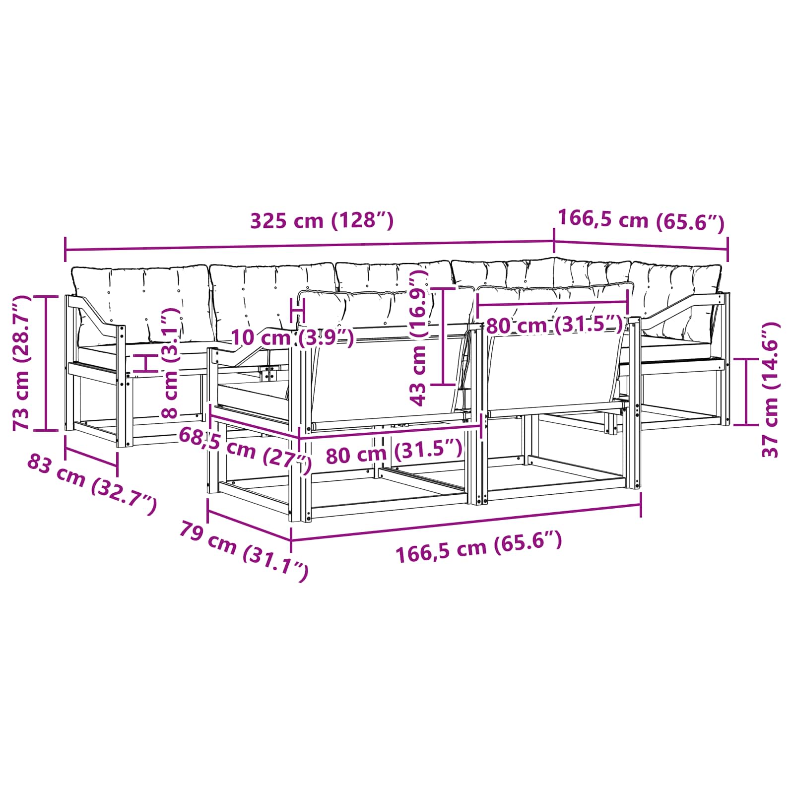 - Gesamtabmessungen: 325 x 166,5 x 73 cm (L x B x H)