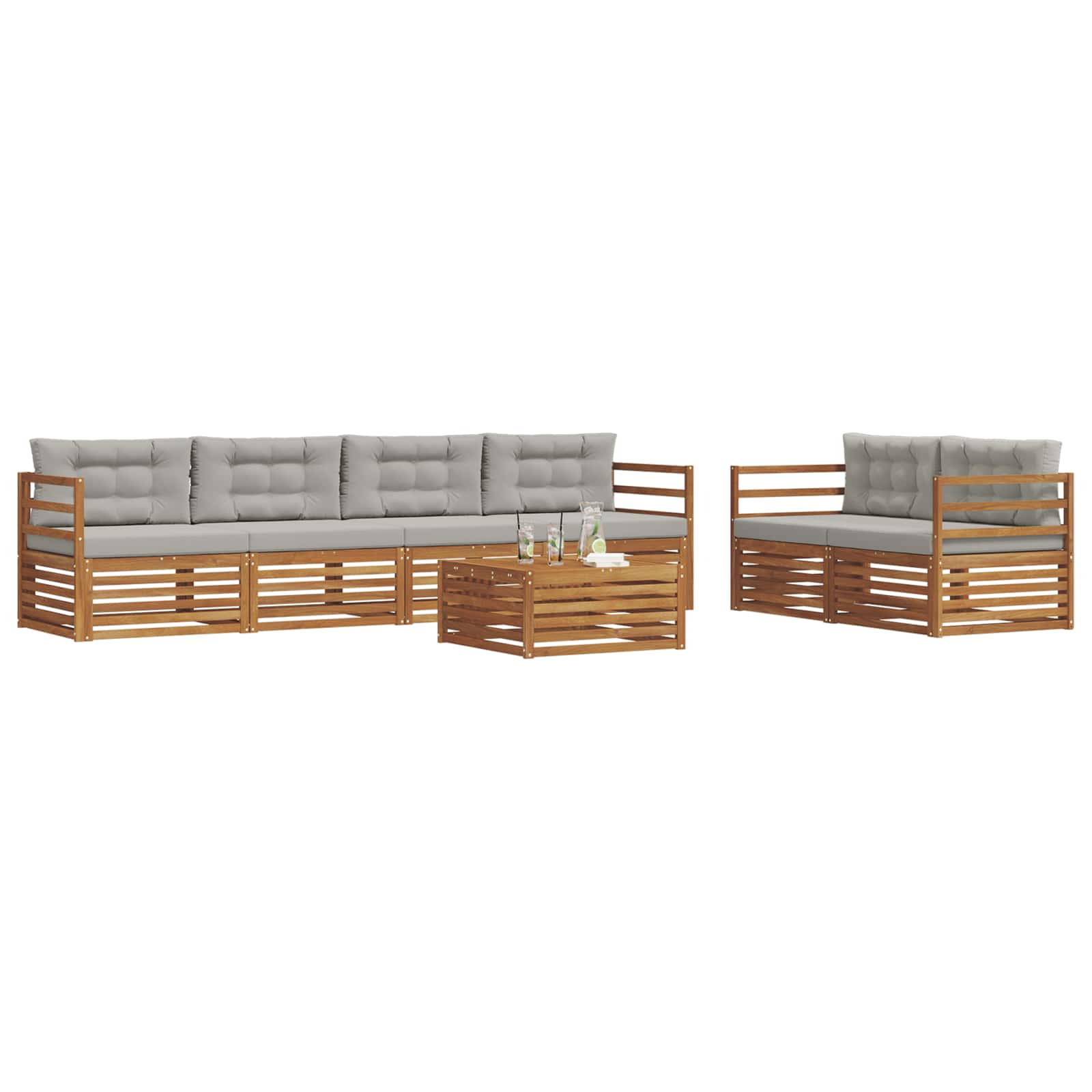 Das Outdoor-Möbelset bringt Stil und Funktionalität zusammen und macht jeden Garten oder jede Terrasse zum Hingucker. Das moderne Design mit klaren Linien und einem minimalistischen Ansatz sorgt für Eleganz und lädt ein, im Freien zu entspannen und Zeit mit Freunden zu verbringen. Hergestellt aus solidem Akazienholz, bietet das Set Langlebigkeit und sieht dabei über lange Zeit gut aus – perfekt für alle, die praktische und coole Möbel für draußen wollen. Langlebiges Massivholz Akazie: Dieses Outdoor-Möbelset aus solidem Akazienholz ist super langlebig und hält auch schlechten Wetterbedingungen stand. Die robuste Bauweise gibt dir stabilen Halt, während der natürliche Farbton gut zu jeder Garten- oder Terrassengestaltung passt. Wetterfestes Design: Das Outdoor-Möbelset hat eine lackierte Oberfläche, die zusätzlichen Schutz gegen Sonne und Regen bietet. Die glatte Oberfläche hilft, das Aussehen und die Funktion zu bewahren, sodass du lange Freude daran hast. Komponenten & Design: Jedes Teil, von den Armlehnen bis zu den Rückenlehnen, ist durchdacht und stilvoll gestaltet. Es bietet zusätzlichen Komfort und sorgt für ein harmonisches Gesamtbild, das für viele Anlässe geeignet ist. Komfort & Vielseitigkeit: Das modulare Design erlaubt flexible Anordnungen für unterschiedliche Bedürfnisse und Räume. Perfekt für Entspannung, gesellige Runden oder ruhige Lesemomente – dieses Set passt sich jeder Outdoor-Umgebung an und macht alles bequemer. Einfache Pflege & Wartung: Um die Möbel in Schuss zu halten, wische einfach die Oberfläche mit einem feuchten Tuch ab und verzichte auf aggressive Reinigungsmittel. Regelmäßige Pflege sorgt dafür, dass sie lange schön bleiben.