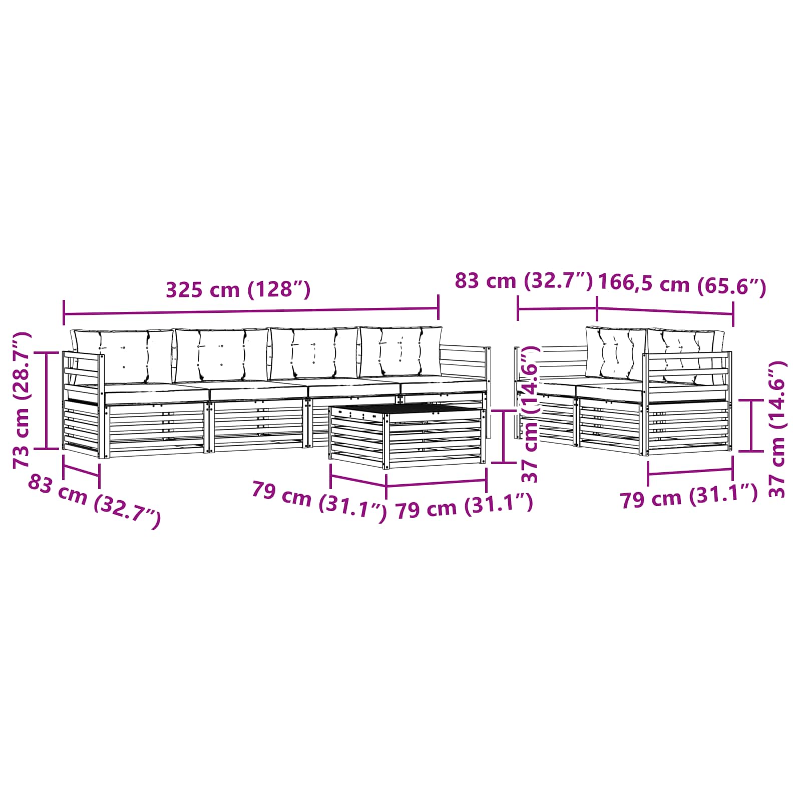 - 6 x Sitzkissen: 80 x 80 x 8 cm (LxBxH)