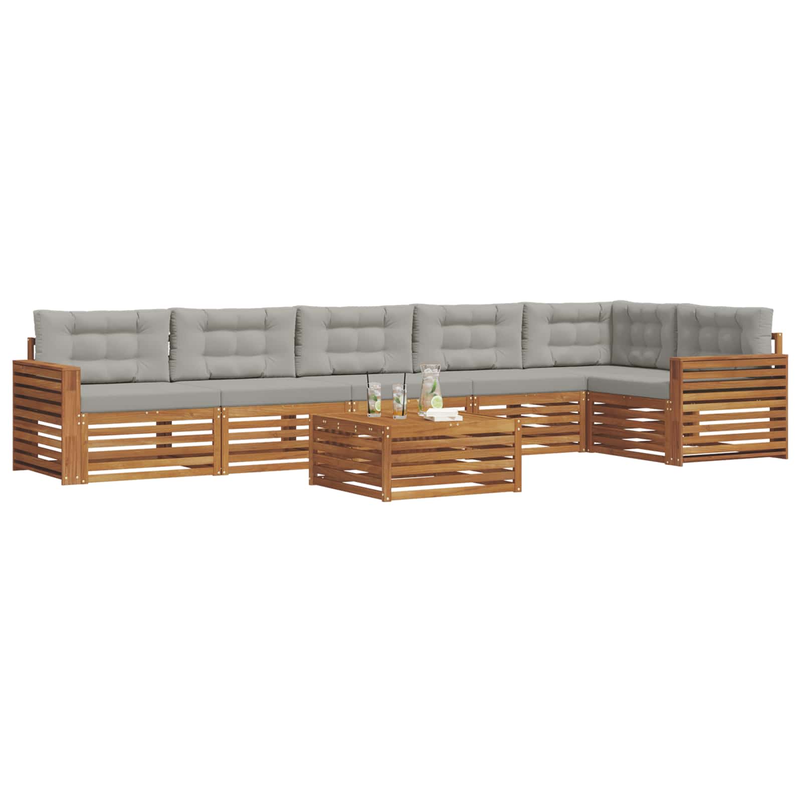 Das Outdoor-Möbelset bringt Stil und Funktionalität zusammen und wird zum beeindruckenden Mittelpunkt für jeden Garten oder jede Terrasse. Das moderne Design mit klaren Linien und minimalen Details sorgt für Eleganz, während es gleichzeitig die Entspannung und das Zusammensein im Freien fördert. Das Set aus solidem Akazienholz garantiert Langlebigkeit und anhaltende visuelle Anziehungskraft und ist perfekt für alle, die praktische und schicke Designs für ihre Outdoor-Möbel suchen. Langlebiges massives Akazienholz: Dieses Outdoor-Möbelset ist aus solidem Akazienholz gefertigt und bekannt für seine Langlebigkeit sowie Widerstandsfähigkeit gegen äußere Bedingungen. Die robuste Bauweise sorgt für Haltbarkeit und Stabilität, während die warme Holzfarbe jeden Garten oder Terrasse aufhellt. Wetterbeständiges Design: Die lackierte Oberfläche schützt gegen Sonne, leichten Regen und andere Umwelteinflüsse. Das polierte Finish hilft, sowohl das Aussehen als auch die Funktionalität zu erhalten, sodass du eine lange Haltbarkeit für deinen Garten, deine Terrasse oder deinen Balkon genießen kannst. Komponenten & Design: Jedes Stück, vom Armrest über Rückenlehnen, hat sowohl Stil als auch Funktion, mit Extras, die zusätzlichen Komfort bieten. Das einheitliche Design sorgt dafür, dass alles gut zusammenpasst und für verschiedene Anlässe im Freien harmonisch aussieht. Komfort & Vielseitigkeit: Das modulare Design bietet flexible Anordnungsmöglichkeiten, die an unterschiedliche Räume und Bedürfnisse anpassbar sind. Ideal zum Entspannen, für Treffen mit Freunden oder ruhige Lesemomente, fügt sich dieses Set mühelos in jede Außenumgebung ein und maximiert Komfort und Funktionalität. Einfache Pflege & Wartung: Halte die Möbel in gutem Zustand, indem du die Oberfläche mit einem feuchten Tuch abwischst und scharfe Reinigungsmittel vermeidest. Regelmäßige Pflege hilft, das Aussehen der Möbel zu bewahren und ihre Lebensdauer zu verlängern.