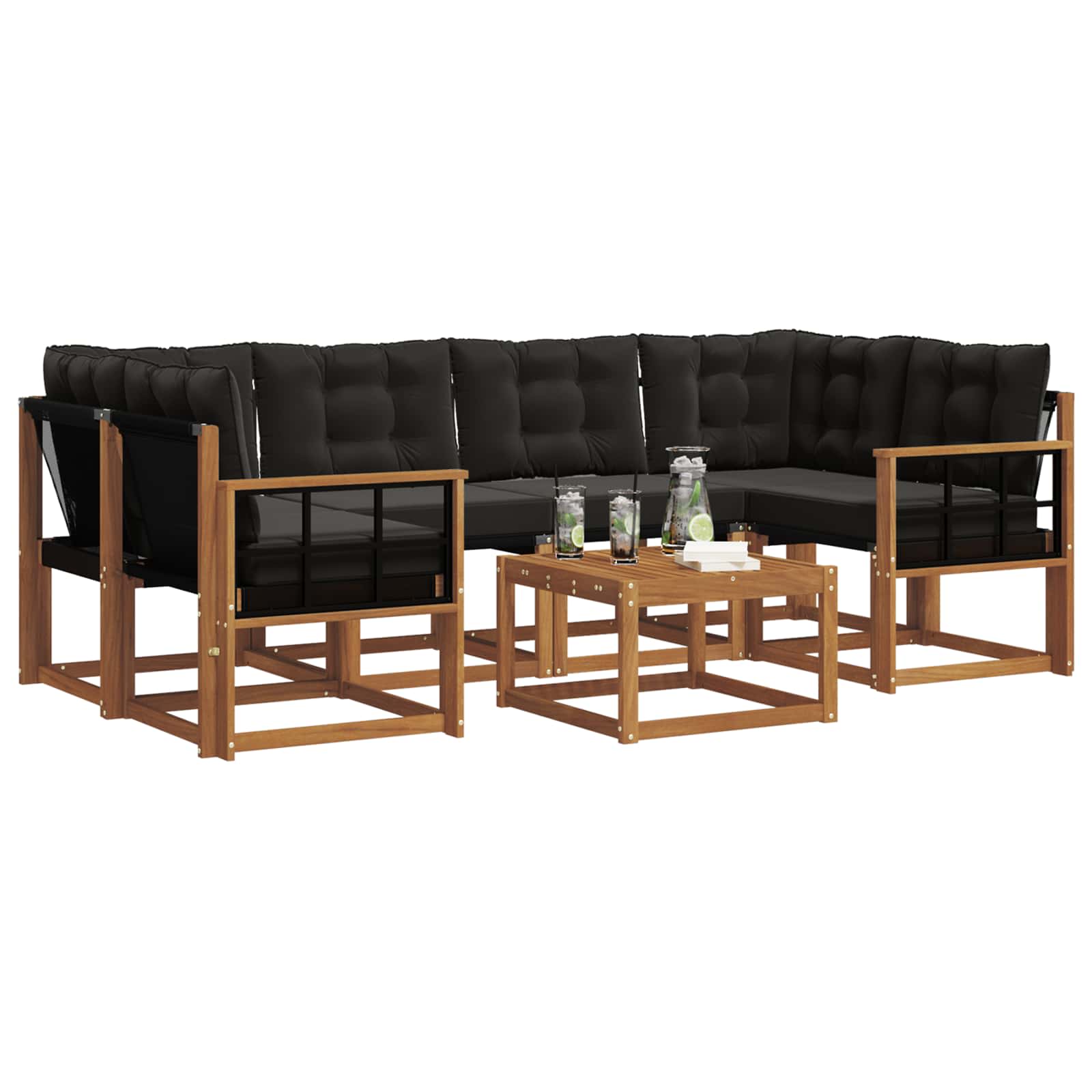 Dieses moderne Sofaset ist der Blickfang für jeden Außenbereich. Mit seinem schlanken, zeitgenössischen Design wertet es deinen Garten, deine Terrasse oder deinen Poolbereich auf. Es hat eine natürliche Holzoptik und unterstützt dich mit komfortablen Rückenlehnen und praktischen Armlehnen. Die erdigen Farbtöne fügen sich harmonisch in die Natur ein und schaffen eine einladende Atmosphäre für Treffen oder entspannte Momente. Elegante Materialkombination: Aus massivem Akazienholz und Textilene gefertigt, bringt dieses Sofaset eine schicke Holzoptik mit einer robusten Textilene-Sitzfläche. Die Materialien sind nicht nur modern, sondern sorgen auch für Langlebigkeit bei jedem Wetter und sind ein treuer Begleiter durch die Jahreszeiten. Umfassendes Komponentendesign: Mit Outdoorkissen und unterstützenden Rückenlehnen designed, ist jedes Teil des Sofasets für optimalen Komfort gemacht. Die praktischen Armlehnen und der Tisch mit Lamellen sorgen für einfache Entwässerung und machen das Set sowohl funktional als auch bequem für dein Entspannungserlebnis im Freien. Praktische Merkmale: Die UV-beständigen Eigenschaften schützen das Sofaset vor Sonnenschäden und halten die Farben lebhaft. Die abwischbaren Oberflächen machen die Pflege kinderleicht und halten das Set frisch und einladend für den täglichen Gebrauch – ideal für das Leben im Freien. Vielseitige Nutzungsmöglichkeiten: Geeignet für Garten, Terrasse, Hinterhof oder Pool, passt sich dieses Sofaset problemlos an verschiedene Außenbereiche an. Sein modernes Design ist die perfekte Ergänzung für Partys oder entspannende Tage an deinem eigenen Rückzugsort. Einfach Pflege: Mit einem durchdachten Design braucht dieses Sofaset nur wenig Pflege – einfach mit einem feuchten Tuch abwischen. Abnehmbare Kissenbezüge mit Reißverschluss machen die Reinigung zum Kinderspiel und helfen, seine Attraktivität zu bewahren.