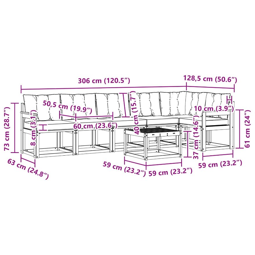 - 7 x Rückenkissen: 60 x 40 x 10 cm (LxWxH)