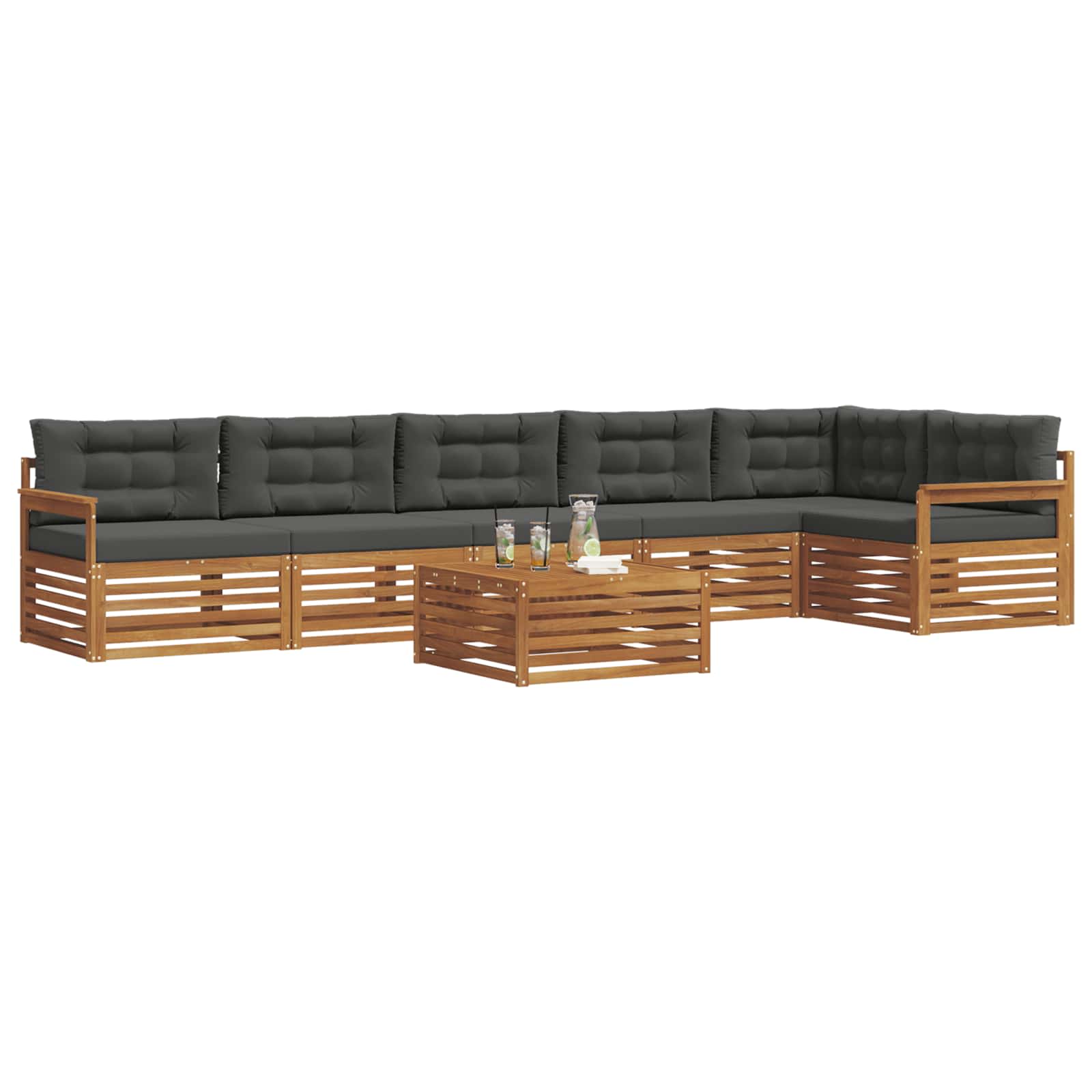 Das Outdoor-Möbelset bringt Stil und Funktionalität zusammen und wird zum beeindruckenden Mittelpunkt für jeden Garten oder jede Terrasse. Das moderne Design mit klaren Linien und minimalen Details sorgt für Eleganz, während es gleichzeitig die Entspannung und das Zusammensein im Freien fördert. Das Set aus solidem Akazienholz garantiert Langlebigkeit und anhaltende visuelle Anziehungskraft und ist perfekt für alle, die praktische und schicke Designs für ihre Outdoor-Möbel suchen. Langlebiges massives Akazienholz: Dieses Outdoor-Möbelset ist aus solidem Akazienholz gefertigt und bekannt für seine Langlebigkeit sowie Widerstandsfähigkeit gegen äußere Bedingungen. Die robuste Bauweise sorgt für Haltbarkeit und Stabilität, während die warme Holzfarbe jeden Garten oder Terrasse aufhellt. Wetterbeständiges Design: Die lackierte Oberfläche schützt gegen Sonne, leichten Regen und andere Umwelteinflüsse. Das polierte Finish hilft, sowohl das Aussehen als auch die Funktionalität zu erhalten, sodass du eine lange Haltbarkeit für deinen Garten, deine Terrasse oder deinen Balkon genießen kannst. Komponenten & Design: Jedes Stück, vom Armrest über Rückenlehnen, hat sowohl Stil als auch Funktion, mit Extras, die zusätzlichen Komfort bieten. Das einheitliche Design sorgt dafür, dass alles gut zusammenpasst und für verschiedene Anlässe im Freien harmonisch aussieht. Komfort & Vielseitigkeit: Das modulare Design bietet flexible Anordnungsmöglichkeiten, die an unterschiedliche Räume und Bedürfnisse anpassbar sind. Ideal zum Entspannen, für Treffen mit Freunden oder ruhige Lesemomente, fügt sich dieses Set mühelos in jede Außenumgebung ein und maximiert Komfort und Funktionalität. Einfache Pflege & Wartung: Halte die Möbel in gutem Zustand, indem du die Oberfläche mit einem feuchten Tuch abwischst und scharfe Reinigungsmittel vermeidest. Regelmäßige Pflege hilft, das Aussehen der Möbel zu bewahren und ihre Lebensdauer zu verlängern.