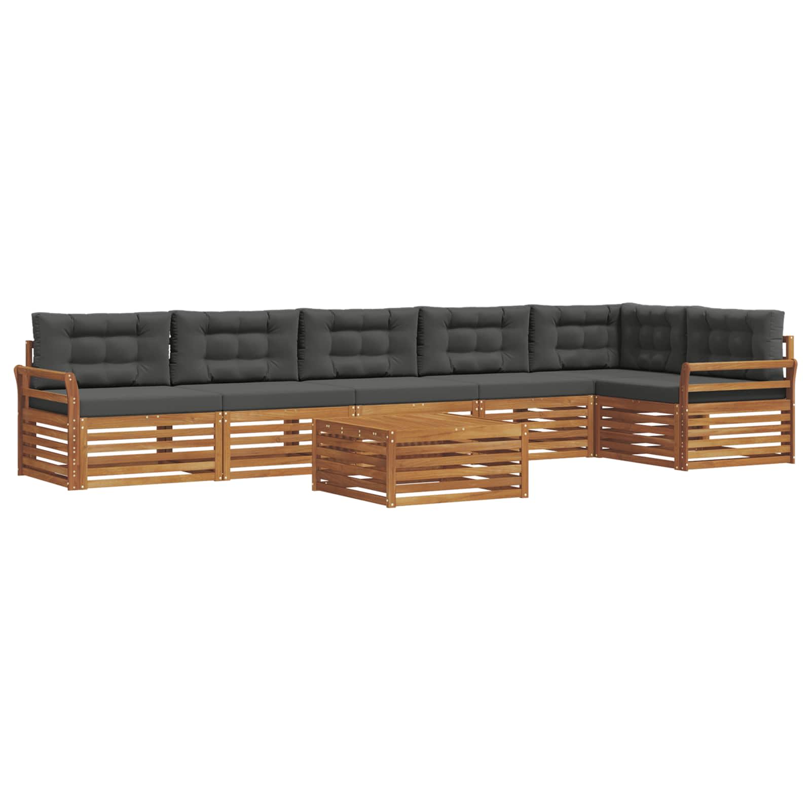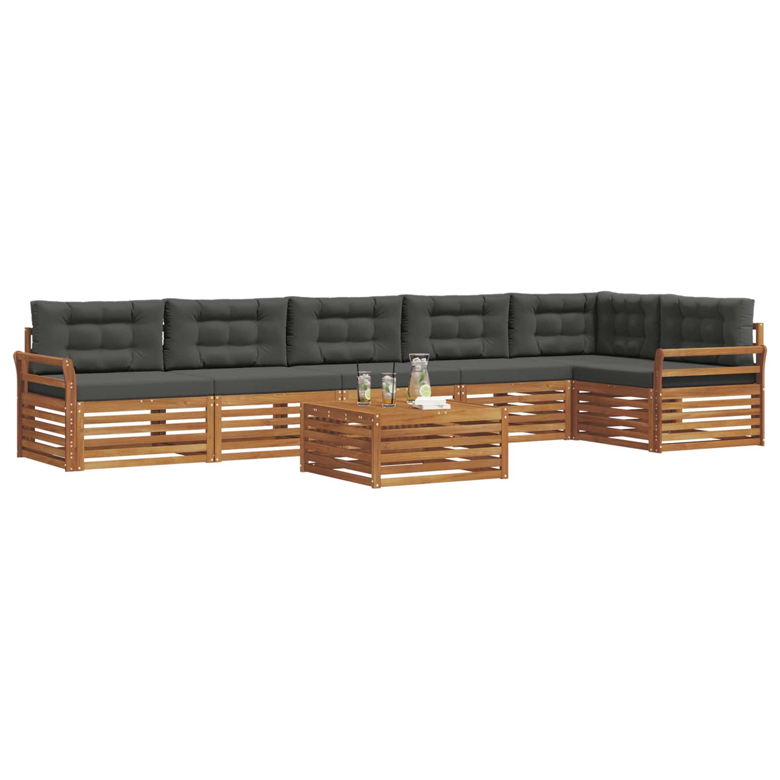 Das Outdoor-Möbelset bringt Stil und Funktionalität zusammen und wird zum beeindruckenden Mittelpunkt für jeden Garten oder jede Terrasse. Das moderne Design mit klaren Linien und minimalen Details sorgt für Eleganz, während es gleichzeitig die Entspannung und das Zusammensein im Freien fördert. Das Set aus solidem Akazienholz garantiert Langlebigkeit und anhaltende visuelle Anziehungskraft und ist perfekt für alle, die praktische und schicke Designs für ihre Outdoor-Möbel suchen. Langlebiges massives Akazienholz: Dieses Outdoor-Möbelset ist aus solidem Akazienholz gefertigt und bekannt für seine Langlebigkeit sowie Widerstandsfähigkeit gegen äußere Bedingungen. Die robuste Bauweise sorgt für Haltbarkeit und Stabilität, während die warme Holzfarbe jeden Garten oder Terrasse aufhellt. Wetterbeständiges Design: Die lackierte Oberfläche schützt gegen Sonne, leichten Regen und andere Umwelteinflüsse. Das polierte Finish hilft, sowohl das Aussehen als auch die Funktionalität zu erhalten, sodass du eine lange Haltbarkeit für deinen Garten, deine Terrasse oder deinen Balkon genießen kannst. Komponenten & Design: Jedes Stück, vom Armrest über Rückenlehnen, hat sowohl Stil als auch Funktion, mit Extras, die zusätzlichen Komfort bieten. Das einheitliche Design sorgt dafür, dass alles gut zusammenpasst und für verschiedene Anlässe im Freien harmonisch aussieht. Komfort & Vielseitigkeit: Das modulare Design bietet flexible Anordnungsmöglichkeiten, die an unterschiedliche Räume und Bedürfnisse anpassbar sind. Ideal zum Entspannen, für Treffen mit Freunden oder ruhige Lesemomente, fügt sich dieses Set mühelos in jede Außenumgebung ein und maximiert Komfort und Funktionalität. Einfache Pflege & Wartung: Halte die Möbel in gutem Zustand, indem du die Oberfläche mit einem feuchten Tuch abwischst und scharfe Reinigungsmittel vermeidest. Regelmäßige Pflege hilft, das Aussehen der Möbel zu bewahren und ihre Lebensdauer zu verlängern.