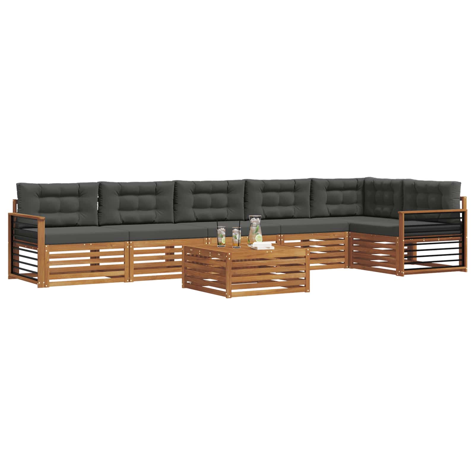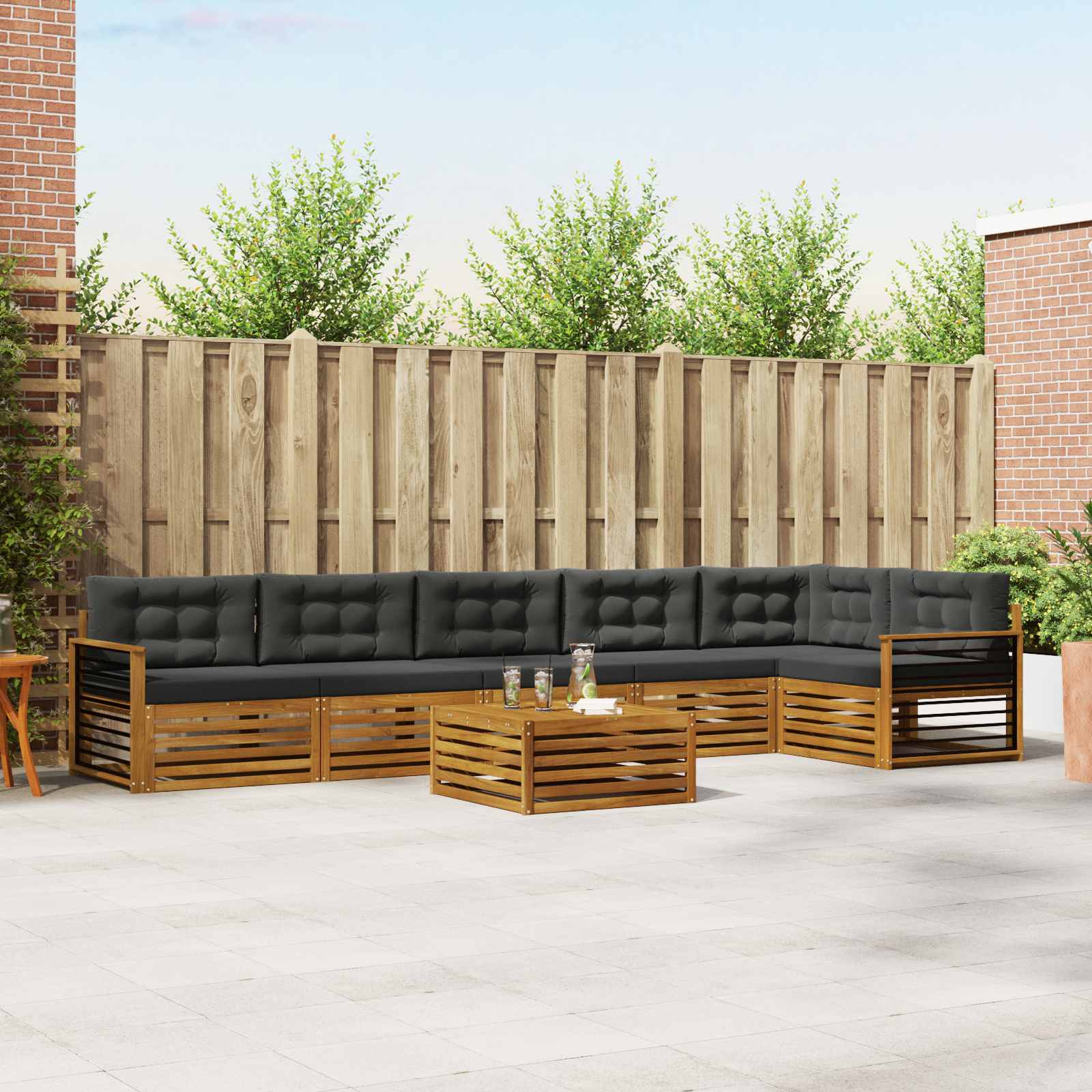 Das Outdoor-Möbelset bringt Stil und Funktionalität zusammen und wird zum beeindruckenden Mittelpunkt für jeden Garten oder jede Terrasse. Das moderne Design mit klaren Linien und minimalen Details sorgt für Eleganz, während es gleichzeitig die Entspannung und das Zusammensein im Freien fördert. Das Set aus solidem Akazienholz garantiert Langlebigkeit und anhaltende visuelle Anziehungskraft und ist perfekt für alle, die praktische und schicke Designs für ihre Outdoor-Möbel suchen. Langlebiges massives Akazienholz: Dieses Outdoor-Möbelset ist aus solidem Akazienholz gefertigt und bekannt für seine Langlebigkeit sowie Widerstandsfähigkeit gegen äußere Bedingungen. Die robuste Bauweise sorgt für Haltbarkeit und Stabilität, während die warme Holzfarbe jeden Garten oder Terrasse aufhellt. Wetterbeständiges Design: Die lackierte Oberfläche schützt gegen Sonne, leichten Regen und andere Umwelteinflüsse. Das polierte Finish hilft, sowohl das Aussehen als auch die Funktionalität zu erhalten, sodass du eine lange Haltbarkeit für deinen Garten, deine Terrasse oder deinen Balkon genießen kannst. Komponenten & Design: Jedes Stück, vom Armrest über Rückenlehnen, hat sowohl Stil als auch Funktion, mit Extras, die zusätzlichen Komfort bieten. Das einheitliche Design sorgt dafür, dass alles gut zusammenpasst und für verschiedene Anlässe im Freien harmonisch aussieht. Komfort & Vielseitigkeit: Das modulare Design bietet flexible Anordnungsmöglichkeiten, die an unterschiedliche Räume und Bedürfnisse anpassbar sind. Ideal zum Entspannen, für Treffen mit Freunden oder ruhige Lesemomente, fügt sich dieses Set mühelos in jede Außenumgebung ein und maximiert Komfort und Funktionalität. Einfache Pflege & Wartung: Halte die Möbel in gutem Zustand, indem du die Oberfläche mit einem feuchten Tuch abwischst und scharfe Reinigungsmittel vermeidest. Regelmäßige Pflege hilft, das Aussehen der Möbel zu bewahren und ihre Lebensdauer zu verlängern.
