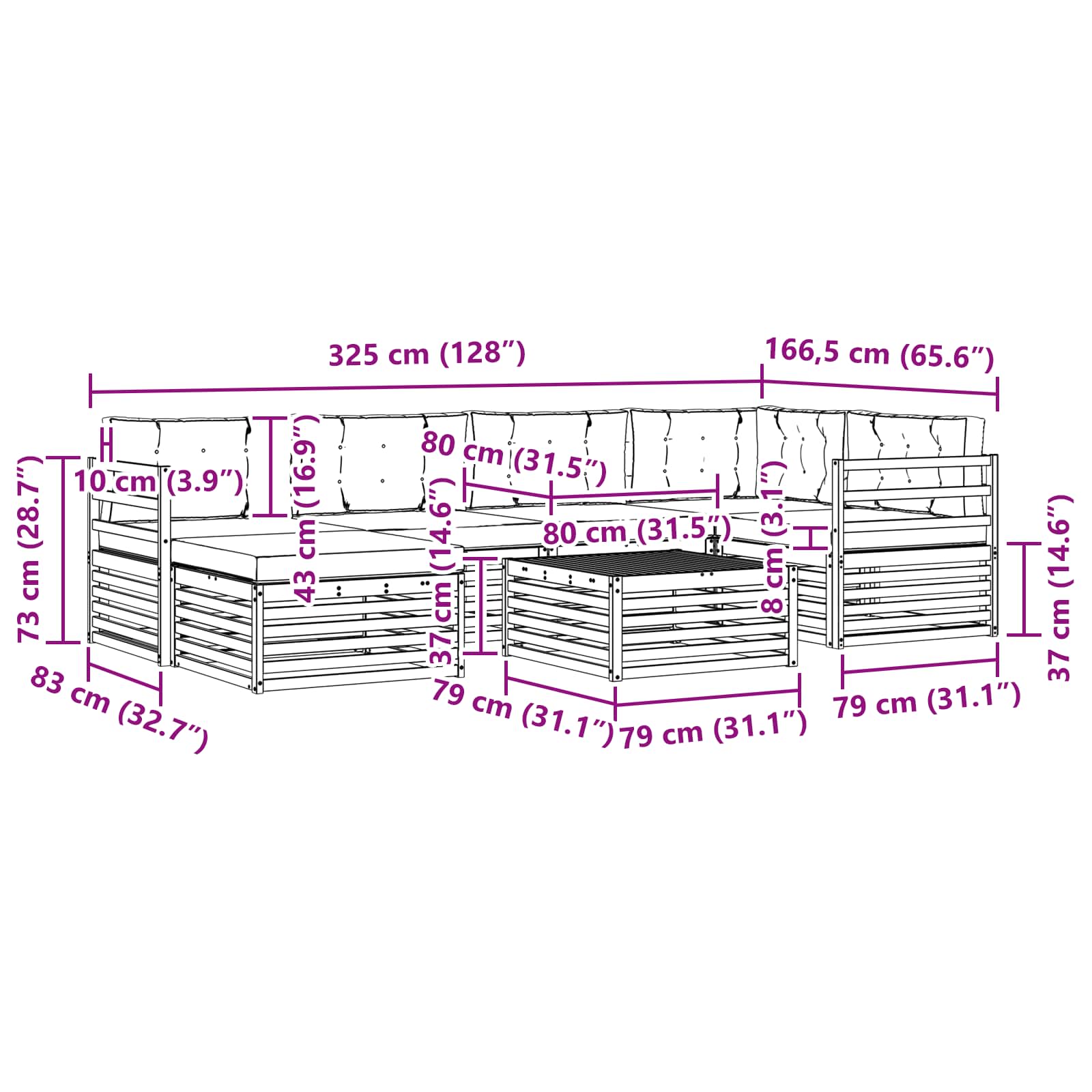 - 6 x Sitzkissen: 80 x 80 x 8 cm (LxBxH)