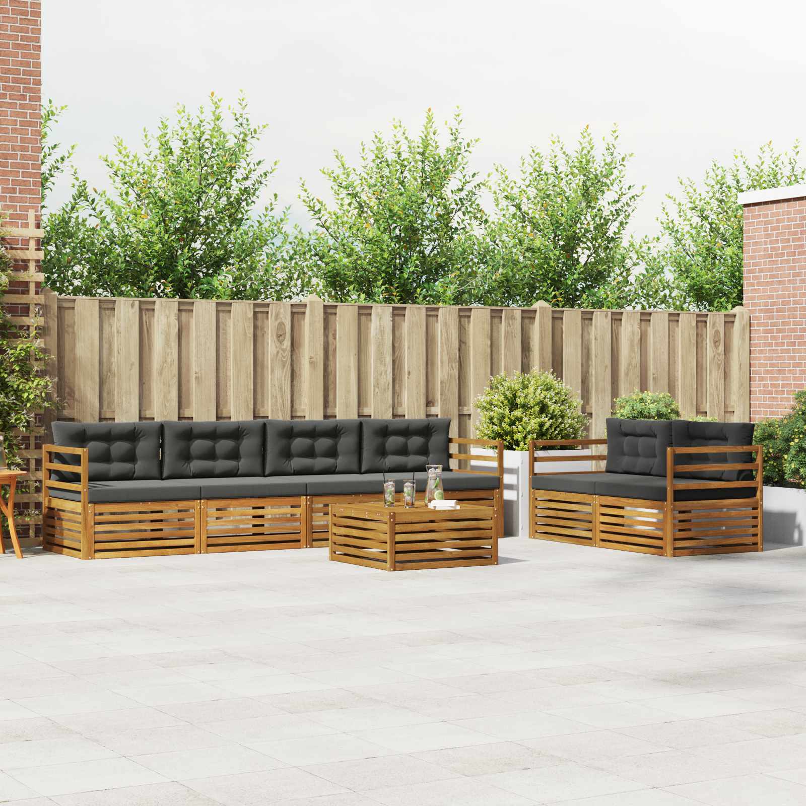 Das Outdoor-Möbelset bringt Stil und Funktionalität zusammen und macht jeden Garten oder jede Terrasse zum Hingucker. Das moderne Design mit klaren Linien und einem minimalistischen Ansatz sorgt für Eleganz und lädt ein, im Freien zu entspannen und Zeit mit Freunden zu verbringen. Hergestellt aus solidem Akazienholz, bietet das Set Langlebigkeit und sieht dabei über lange Zeit gut aus – perfekt für alle, die praktische und coole Möbel für draußen wollen. Langlebiges Massivholz Akazie: Dieses Outdoor-Möbelset aus solidem Akazienholz ist super langlebig und hält auch schlechten Wetterbedingungen stand. Die robuste Bauweise gibt dir stabilen Halt, während der natürliche Farbton gut zu jeder Garten- oder Terrassengestaltung passt. Wetterfestes Design: Das Outdoor-Möbelset hat eine lackierte Oberfläche, die zusätzlichen Schutz gegen Sonne und Regen bietet. Die glatte Oberfläche hilft, das Aussehen und die Funktion zu bewahren, sodass du lange Freude daran hast. Komponenten & Design: Jedes Teil, von den Armlehnen bis zu den Rückenlehnen, ist durchdacht und stilvoll gestaltet. Es bietet zusätzlichen Komfort und sorgt für ein harmonisches Gesamtbild, das für viele Anlässe geeignet ist. Komfort & Vielseitigkeit: Das modulare Design erlaubt flexible Anordnungen für unterschiedliche Bedürfnisse und Räume. Perfekt für Entspannung, gesellige Runden oder ruhige Lesemomente – dieses Set passt sich jeder Outdoor-Umgebung an und macht alles bequemer. Einfache Pflege & Wartung: Um die Möbel in Schuss zu halten, wische einfach die Oberfläche mit einem feuchten Tuch ab und verzichte auf aggressive Reinigungsmittel. Regelmäßige Pflege sorgt dafür, dass sie lange schön bleiben.