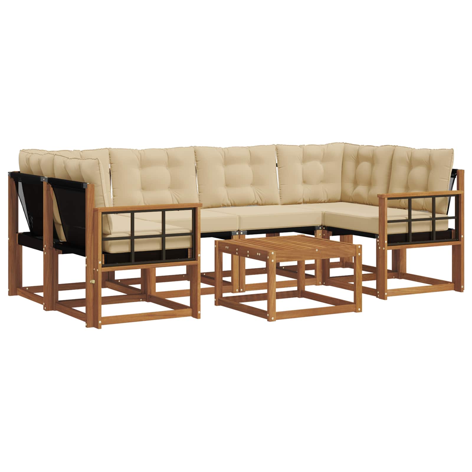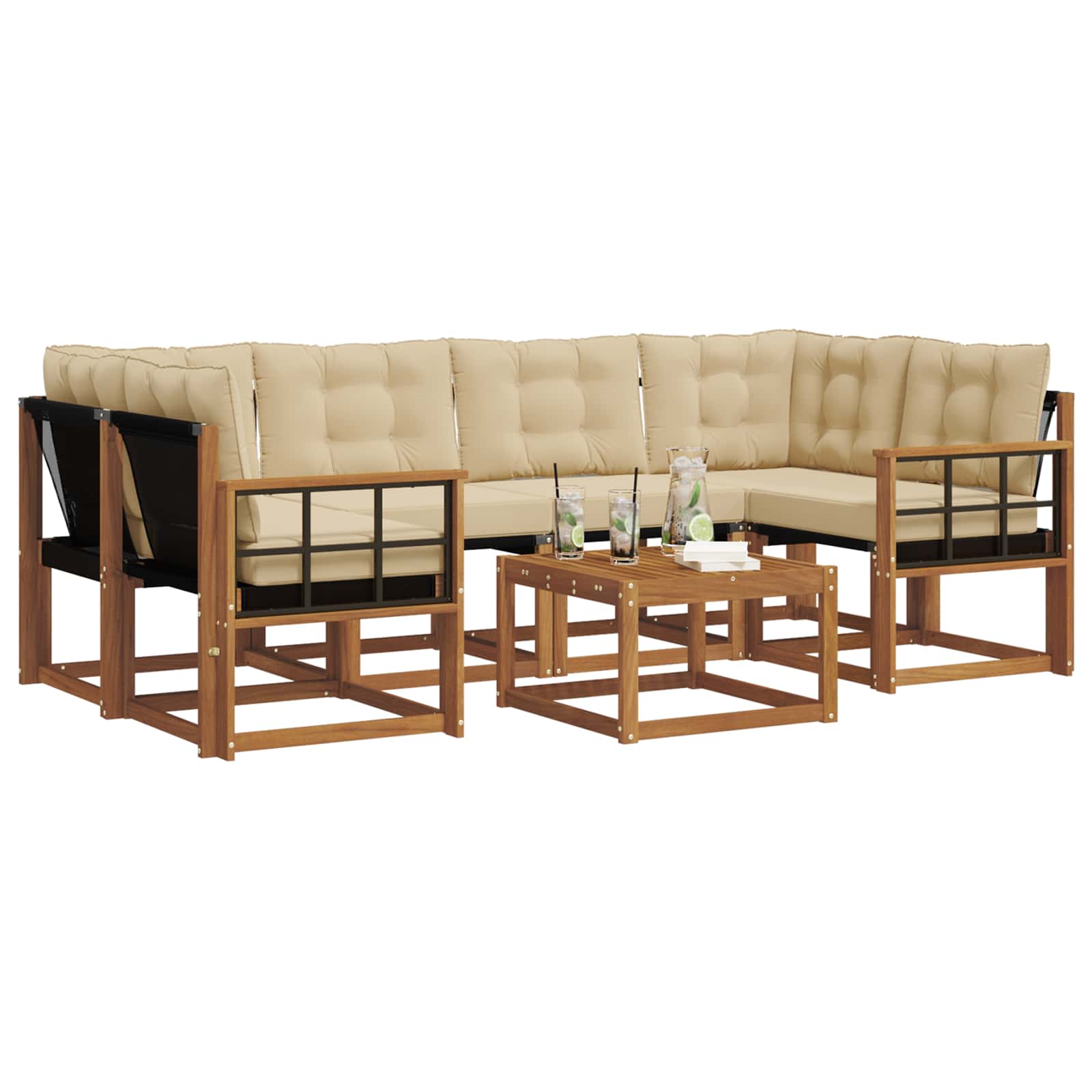 Dieses moderne Sofaset ist der Blickfang für jeden Außenbereich. Mit seinem schlanken, zeitgenössischen Design wertet es deinen Garten, deine Terrasse oder deinen Poolbereich auf. Es hat eine natürliche Holzoptik und unterstützt dich mit komfortablen Rückenlehnen und praktischen Armlehnen. Die erdigen Farbtöne fügen sich harmonisch in die Natur ein und schaffen eine einladende Atmosphäre für Treffen oder entspannte Momente. Elegante Materialkombination: Aus massivem Akazienholz und Textilene gefertigt, bringt dieses Sofaset eine schicke Holzoptik mit einer robusten Textilene-Sitzfläche. Die Materialien sind nicht nur modern, sondern sorgen auch für Langlebigkeit bei jedem Wetter und sind ein treuer Begleiter durch die Jahreszeiten. Umfassendes Komponentendesign: Mit Outdoorkissen und unterstützenden Rückenlehnen designed, ist jedes Teil des Sofasets für optimalen Komfort gemacht. Die praktischen Armlehnen und der Tisch mit Lamellen sorgen für einfache Entwässerung und machen das Set sowohl funktional als auch bequem für dein Entspannungserlebnis im Freien. Praktische Merkmale: Die UV-beständigen Eigenschaften schützen das Sofaset vor Sonnenschäden und halten die Farben lebhaft. Die abwischbaren Oberflächen machen die Pflege kinderleicht und halten das Set frisch und einladend für den täglichen Gebrauch – ideal für das Leben im Freien. Vielseitige Nutzungsmöglichkeiten: Geeignet für Garten, Terrasse, Hinterhof oder Pool, passt sich dieses Sofaset problemlos an verschiedene Außenbereiche an. Sein modernes Design ist die perfekte Ergänzung für Partys oder entspannende Tage an deinem eigenen Rückzugsort. Einfach Pflege: Mit einem durchdachten Design braucht dieses Sofaset nur wenig Pflege – einfach mit einem feuchten Tuch abwischen. Abnehmbare Kissenbezüge mit Reißverschluss machen die Reinigung zum Kinderspiel und helfen, seine Attraktivität zu bewahren.