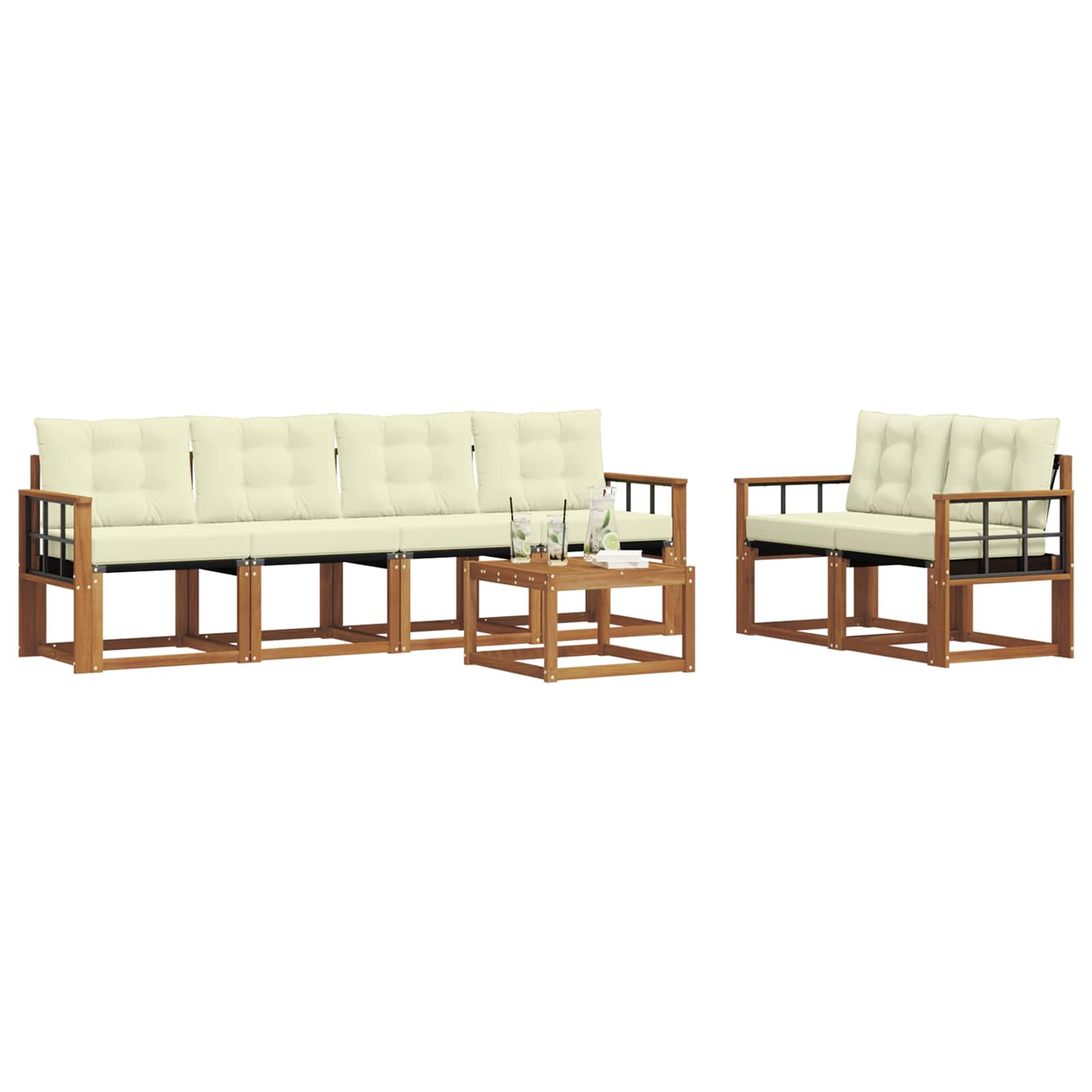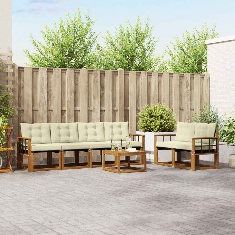 Das Gartenmöbel-Set verbindet Stil und Funktionalität und ist ein echter Hingucker für jeden Garten oder jede Terrasse. Es hat ein modernes Design mit klaren Linien und minimalen Details, das Eleganz verleiht, während es entspannende Aufenthalte und gesellige Treffen unterstützt. Komplett aus massivem Akazienholz gefertigt, ist das Set langlebig und sieht gut aus, perfekt für alle, die sowohl Praktikabilität als auch stilvolles Design bei ihren Außenmöbeln suchen. Langlebiges massives Akazienholz: Dieses Gartenmöbel-Set ist aus massivem Akazienholz und bekannt für seine Langlebigkeit und Widerstandsfähigkeit. Robuste Verarbeitung sorgt für gute Unterstützung und Stabilität, während der warme Holztönen jeden Garten oder jede Terrasse aufwertet. Wetterbeständiges Design: Mit einer lackierten Oberfläche hat das Set einen zusätzlichen Schutz gegen Sonne und leichten Regen. Die polierte Oberfläche bewahrt das schöne Aussehen und die Funktionalität für eine lange Lebensdauer in deinem Garten, auf deiner Terrasse oder in deinem Hinterhof. Komponenten & Design: Jedes Stück, von Armlehnen bis Rückenlehnen, ist sowohl stylisch als auch funktional. Zusätzliche Stütze sorgt für mehr Komfort, während das ansprechende Design ein harmonisches Gesamtbild schafft, das für verschiedene Outdoor-Anlässe passt. Komfort & Vielseitigkeit: Das modulare Design ermöglicht flexible Anordnungen, die zu diversen Räumen und Bedürfnissen passen. Perfekt zum Entspannen, für gesellige Zusammenkünfte oder ruhige Lesemomente – dieses Set passt sich ganz einfach an jede Außenumgebung an und maximiert Komfort und Benutzerfreundlichkeit. Einfache Pflege & Wartung: Halte das Möbelset in gutem Zustand, indem du die Oberfläche mit einem feuchten Tuch reinigst und aggressive Reiniger vermeidest. Regelmäßige Pflege hält das Aussehen frisch und verlängert die Lebensdauer der Möbel.
