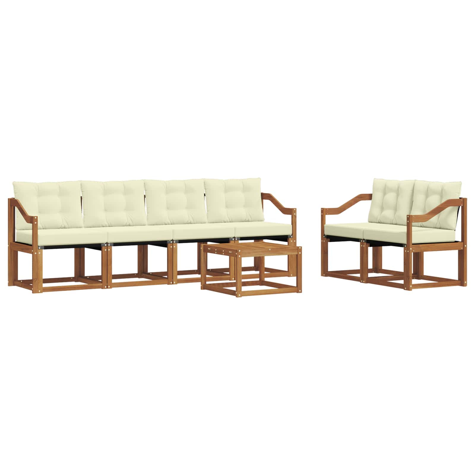 Das Gartenmöbel-Set verbindet Stil und Funktionalität und ist ein echter Hingucker für jeden Garten oder jede Terrasse. Es hat ein modernes Design mit klaren Linien und minimalen Details, das Eleganz verleiht, während es entspannende Aufenthalte und gesellige Treffen unterstützt. Komplett aus massivem Akazienholz gefertigt, ist das Set langlebig und sieht gut aus, perfekt für alle, die sowohl Praktikabilität als auch stilvolles Design bei ihren Außenmöbeln suchen. Langlebiges massives Akazienholz: Dieses Gartenmöbel-Set ist aus massivem Akazienholz und bekannt für seine Langlebigkeit und Widerstandsfähigkeit. Robuste Verarbeitung sorgt für gute Unterstützung und Stabilität, während der warme Holztönen jeden Garten oder jede Terrasse aufwertet. Wetterbeständiges Design: Mit einer lackierten Oberfläche hat das Set einen zusätzlichen Schutz gegen Sonne und leichten Regen. Die polierte Oberfläche bewahrt das schöne Aussehen und die Funktionalität für eine lange Lebensdauer in deinem Garten, auf deiner Terrasse oder in deinem Hinterhof. Komponenten & Design: Jedes Stück, von Armlehnen bis Rückenlehnen, ist sowohl stylisch als auch funktional. Zusätzliche Stütze sorgt für mehr Komfort, während das ansprechende Design ein harmonisches Gesamtbild schafft, das für verschiedene Outdoor-Anlässe passt. Komfort & Vielseitigkeit: Das modulare Design ermöglicht flexible Anordnungen, die zu diversen Räumen und Bedürfnissen passen. Perfekt zum Entspannen, für gesellige Zusammenkünfte oder ruhige Lesemomente – dieses Set passt sich ganz einfach an jede Außenumgebung an und maximiert Komfort und Benutzerfreundlichkeit. Einfache Pflege & Wartung: Halte das Möbelset in gutem Zustand, indem du die Oberfläche mit einem feuchten Tuch reinigst und aggressive Reiniger vermeidest. Regelmäßige Pflege hält das Aussehen frisch und verlängert die Lebensdauer der Möbel.