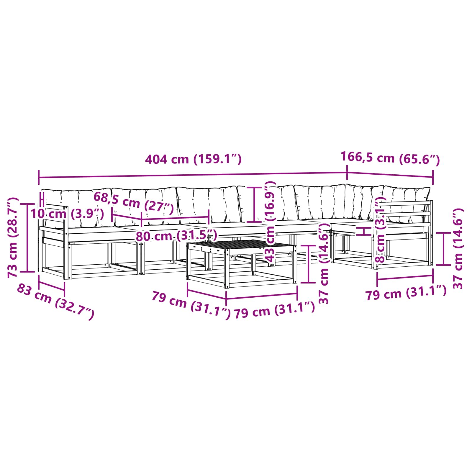 - 7 x Rückenpolster: 80 x 43 x 10 cm (LxBxH)