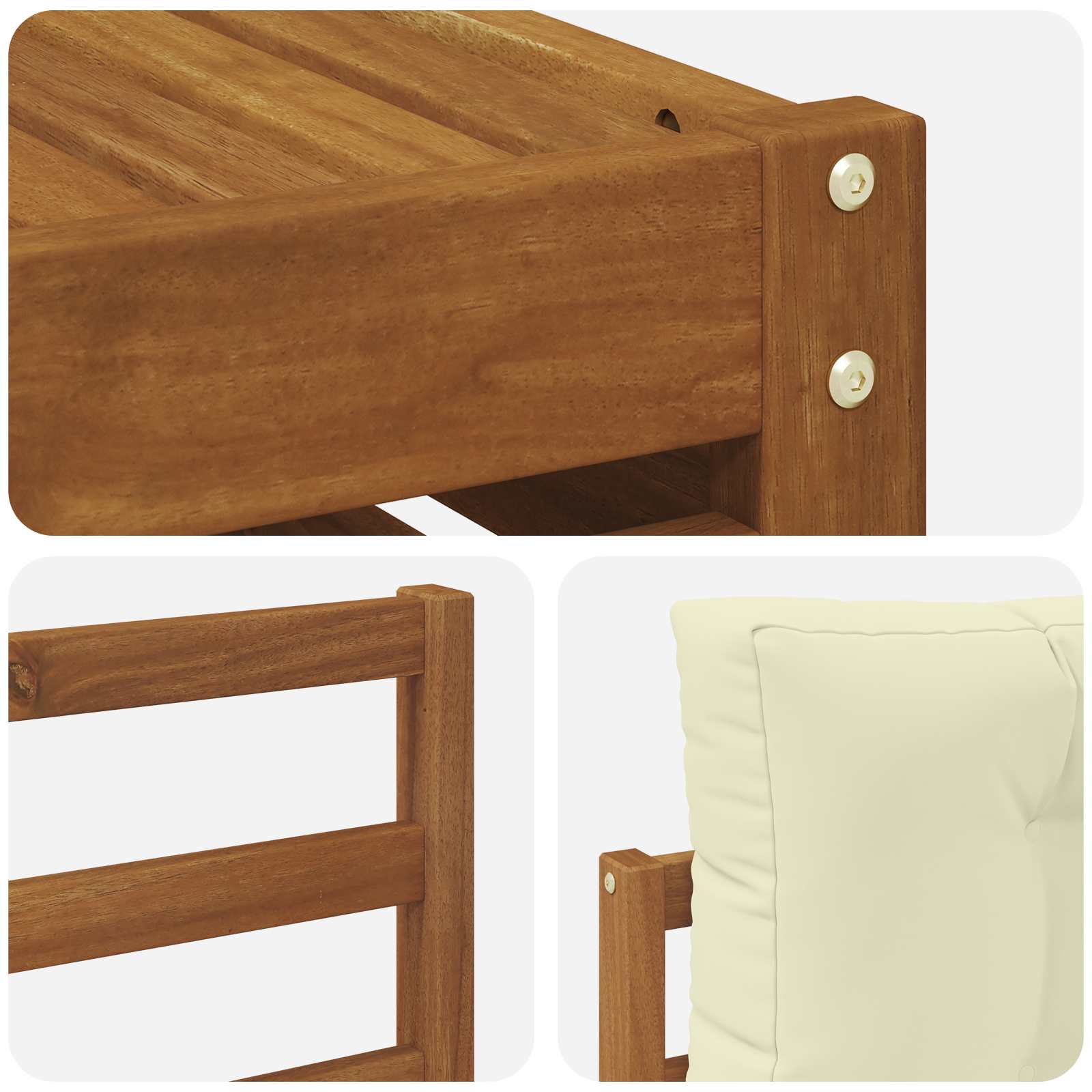 Das Outdoor-Möbelset bringt Stil und Funktionalität zusammen und wird zum beeindruckenden Mittelpunkt für jeden Garten oder jede Terrasse. Das moderne Design mit klaren Linien und minimalen Details sorgt für Eleganz, während es gleichzeitig die Entspannung und das Zusammensein im Freien fördert. Das Set aus solidem Akazienholz garantiert Langlebigkeit und anhaltende visuelle Anziehungskraft und ist perfekt für alle, die praktische und schicke Designs für ihre Outdoor-Möbel suchen. Langlebiges massives Akazienholz: Dieses Outdoor-Möbelset ist aus solidem Akazienholz gefertigt und bekannt für seine Langlebigkeit sowie Widerstandsfähigkeit gegen äußere Bedingungen. Die robuste Bauweise sorgt für Haltbarkeit und Stabilität, während die warme Holzfarbe jeden Garten oder Terrasse aufhellt. Wetterbeständiges Design: Die lackierte Oberfläche schützt gegen Sonne, leichten Regen und andere Umwelteinflüsse. Das polierte Finish hilft, sowohl das Aussehen als auch die Funktionalität zu erhalten, sodass du eine lange Haltbarkeit für deinen Garten, deine Terrasse oder deinen Balkon genießen kannst. Komponenten & Design: Jedes Stück, vom Armrest über Rückenlehnen, hat sowohl Stil als auch Funktion, mit Extras, die zusätzlichen Komfort bieten. Das einheitliche Design sorgt dafür, dass alles gut zusammenpasst und für verschiedene Anlässe im Freien harmonisch aussieht. Komfort & Vielseitigkeit: Das modulare Design bietet flexible Anordnungsmöglichkeiten, die an unterschiedliche Räume und Bedürfnisse anpassbar sind. Ideal zum Entspannen, für Treffen mit Freunden oder ruhige Lesemomente, fügt sich dieses Set mühelos in jede Außenumgebung ein und maximiert Komfort und Funktionalität. Einfache Pflege & Wartung: Halte die Möbel in gutem Zustand, indem du die Oberfläche mit einem feuchten Tuch abwischst und scharfe Reinigungsmittel vermeidest. Regelmäßige Pflege hilft, das Aussehen der Möbel zu bewahren und ihre Lebensdauer zu verlängern.