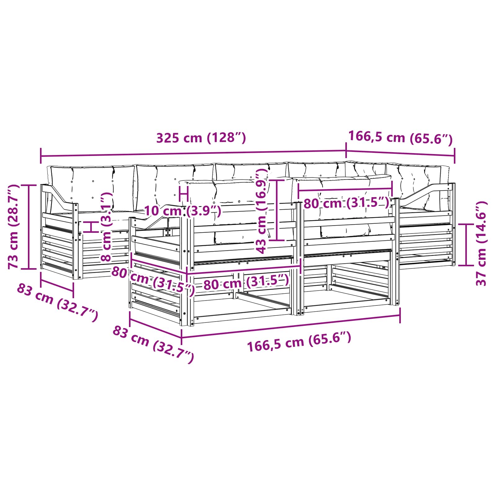 - Gesamtabmessungen: 325 x 166,5 x 73 cm (L x B x H)