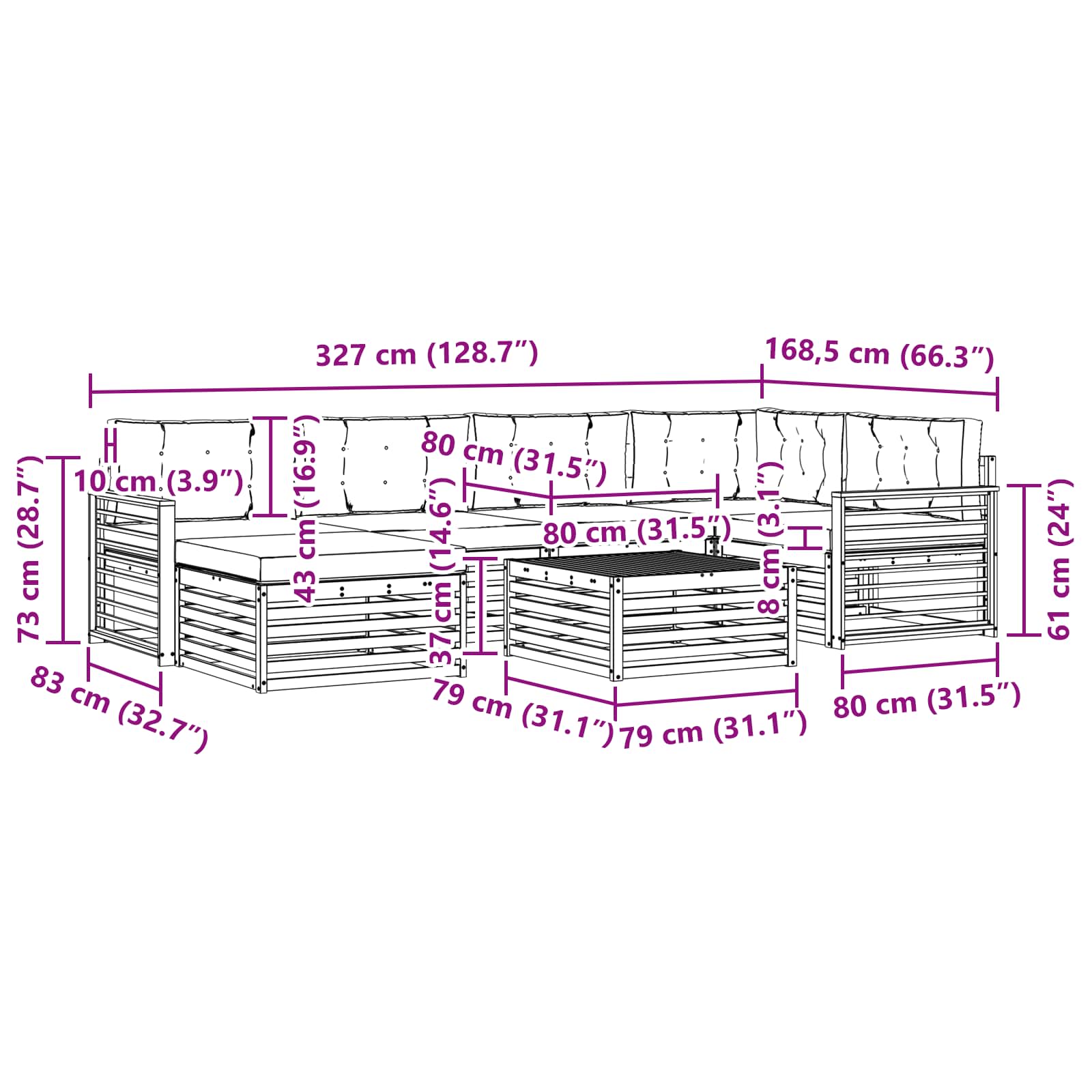 - 6 x Sitzkissen: 80 x 80 x 8 cm (LxBxH)