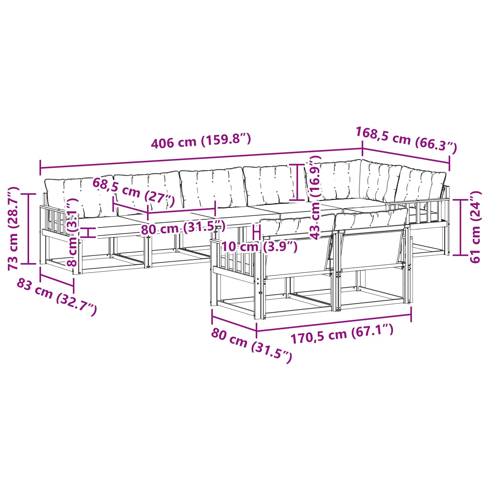 - 7 x Sitzkissen: 80 x 68,5 x 8 cm (LxBxH)