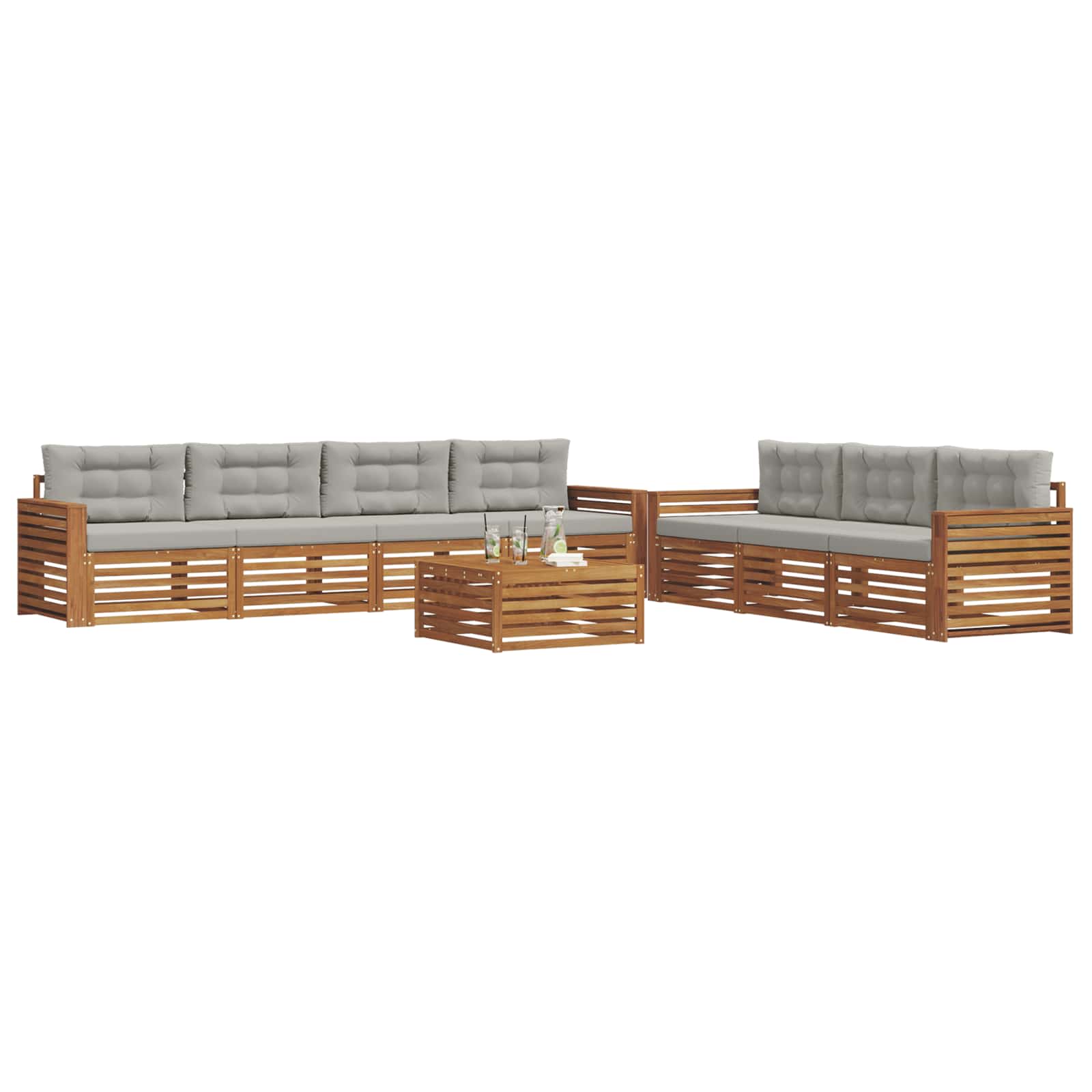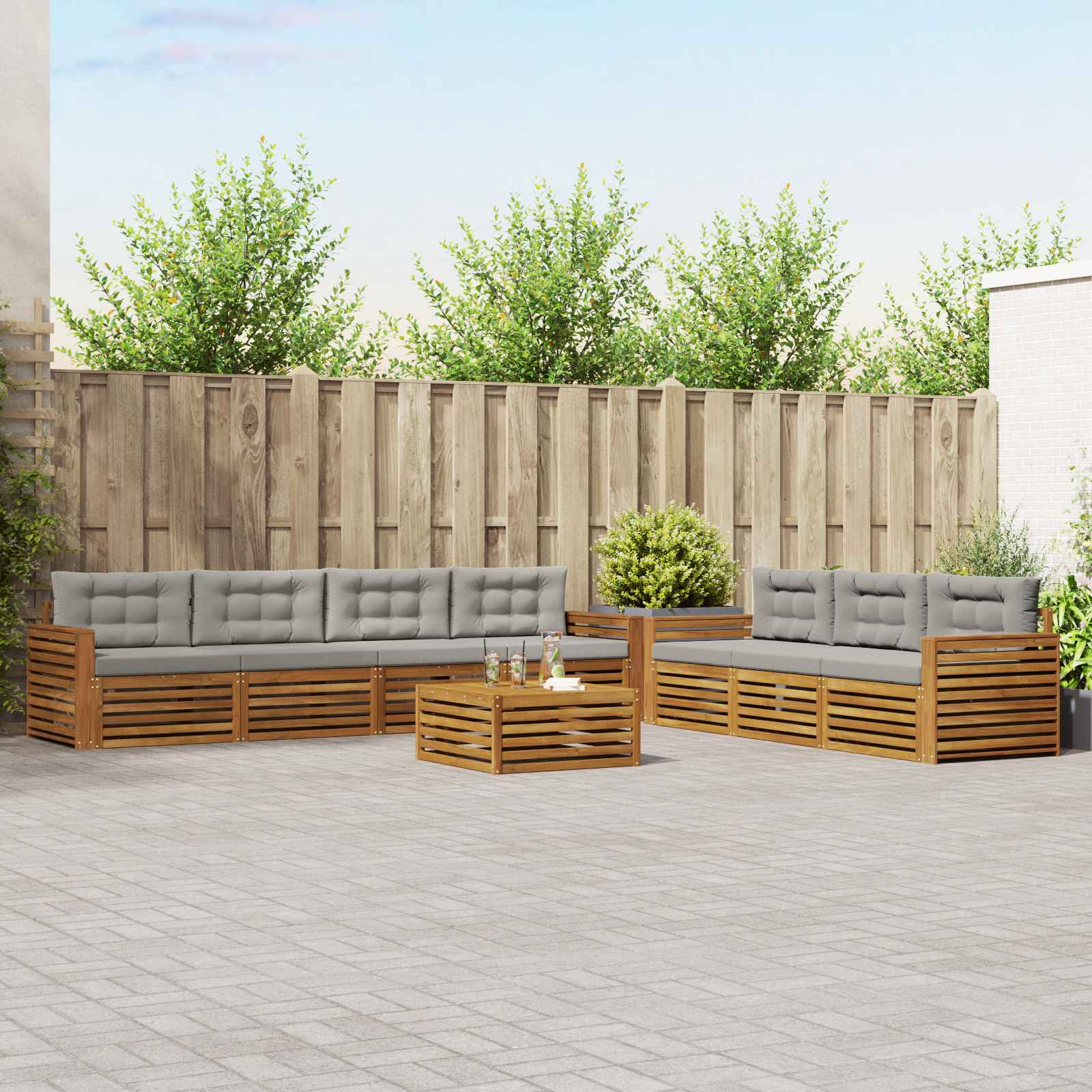 Das Gartenmöbelset kombiniert Stil und Funktion zu einem echten Hingucker für jeden Garten oder jede Terrasse. Das moderne Design mit klaren Linien sorgt für Eleganz und ist perfekt für entspannte Stunden im Freien oder gesellige Treffen mit Freunden. Aus massivem Akazienholz gefertigt, bietet das Set nicht nur Langlebigkeit, sondern sieht auch klasse aus. Es ist die ideale Wahl für alle, die praktische und schöne Gartenmöbel suchen. Langlebiges Massivholz Akazie: Hergestellt aus robustem Akazienholz ist dieses Outdoor-Möbelset nicht nur langlebig, sondern auch widerstandsfähig gegen alle äußeren Einflüsse. Die starke Bauweise sorgt für Stabilität, während der warme Farbton deinem Garten oder deiner Terrasse einen schönen Akzent verleiht. Wetterfeste Konstruktion: Die Möbel haben eine lackierte Oberfläche, die zusätzlichen Schutz gegen Sonne, Regen und andere Witterungen bietet. Das macht sie pflegeleicht und sorgt für eine lange Lebensdauer, egal ob im Garten, auf der Terrasse oder im Hinterhof. Komponenten & Design: Jedes Teil vom Rahmen bis zu den Rückenlehnen ist durchdacht gestaltet. Die unterstützenden Features sorgen für zusätzlichen Komfort, während das harmonische Design zu einem tollen Gesamtbild beiträgt, das bei allen Anlässen im Freien passt. Komfort & Vielseitigkeit: Das modulare Design lässt sich flexibel an verschiedene Räume und Bedürfnisse anpassen. Ideal für ruhige Lesemomente, gesellige Abende oder einfach zum Relaxen – dieses Set macht in jeder Umgebung eine gute Figur und bietet maximalen Komfort. Einfache Pflege & Wartung: Um die Möbel schön zu halten, wische die Oberfläche mit einem feuchten Tuch ab und verwende keine starken Reiniger. So bleibt das Aussehen erhalten und die Lebensdauer der Möbel verlängert sich.