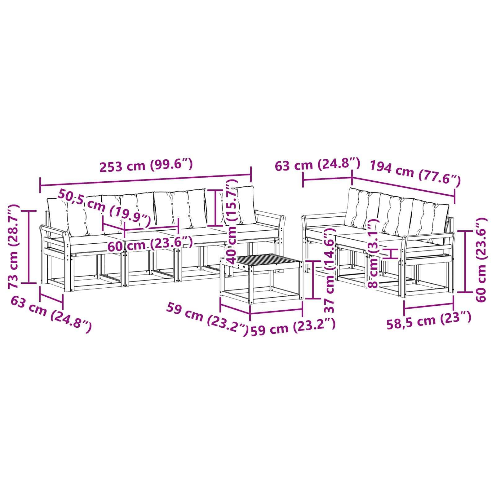 - 7 x Sitzkissen: 60 x 50,5 x 8 cm (LxBxH)