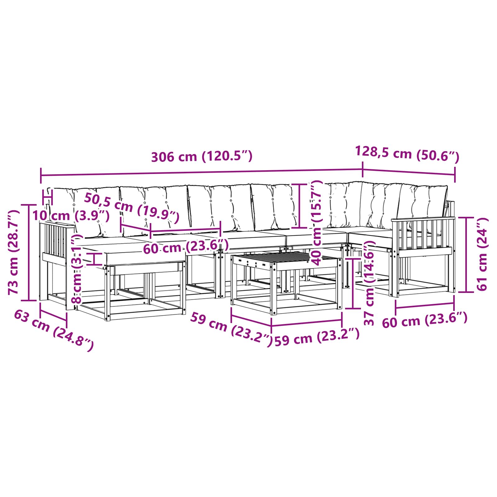- 7 x Rückenkissen: 60 x 40 x 10 cm (LxWxH)
