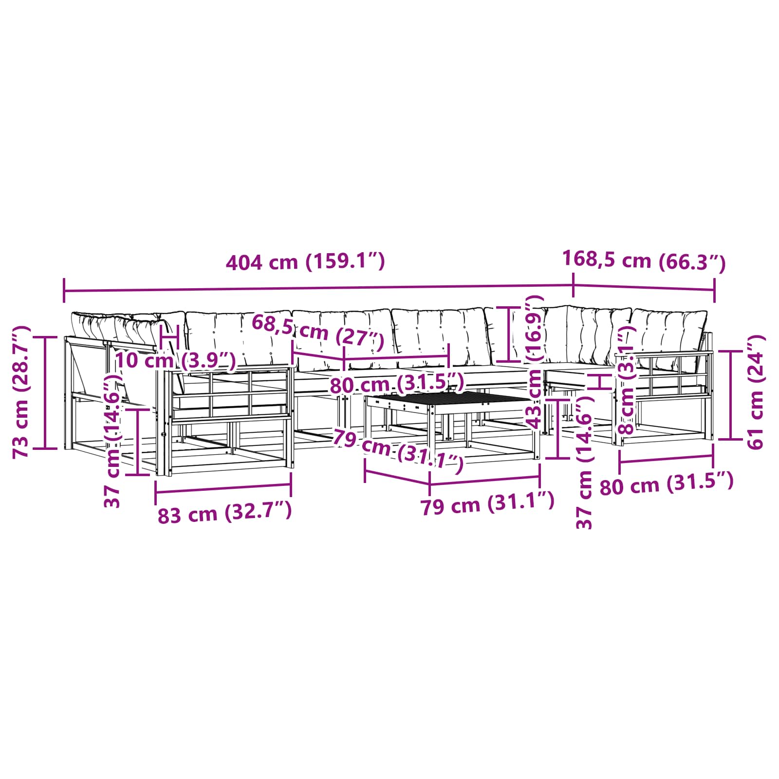- 9 x Rückenkissen: 80 x 43 x 10 cm (LxBxH)