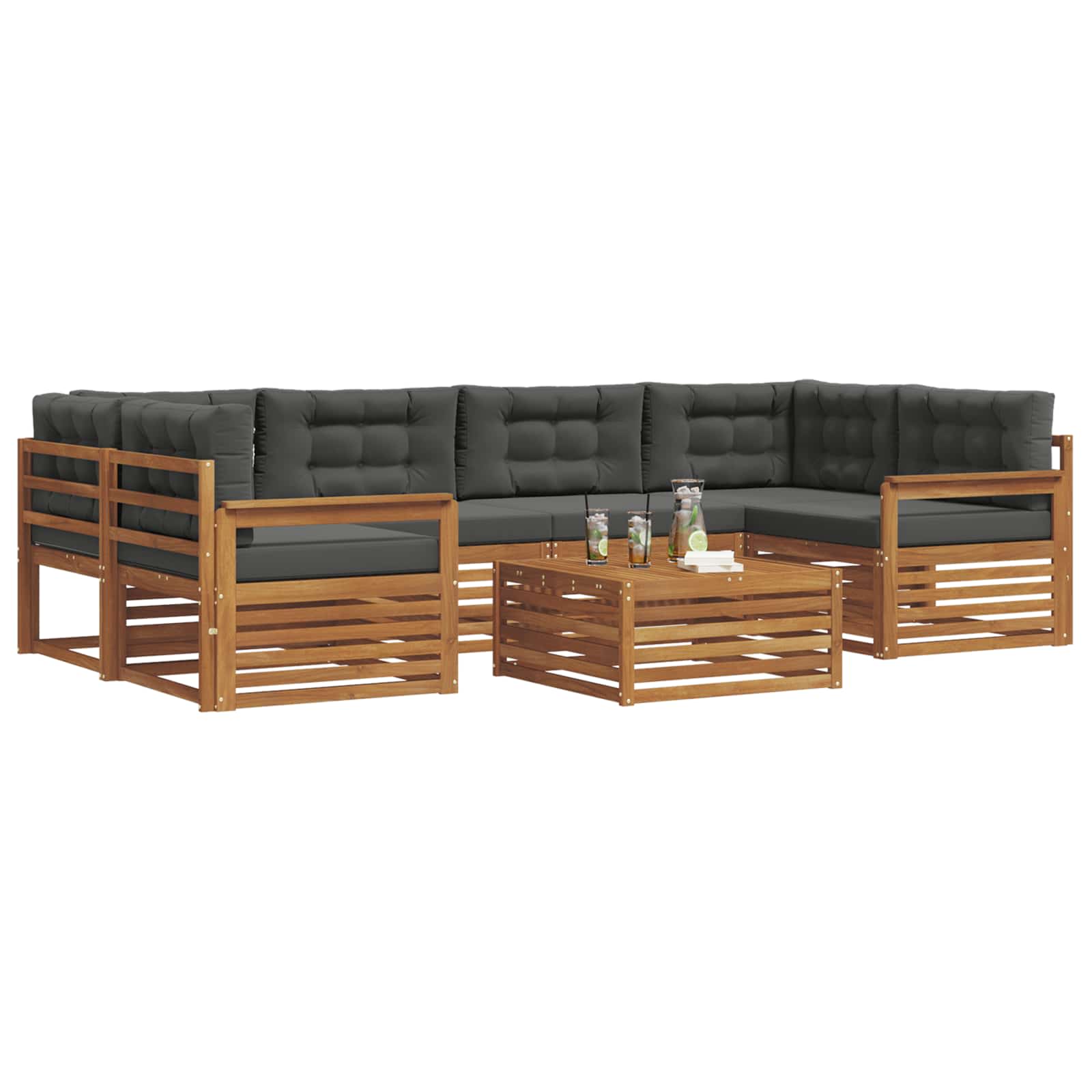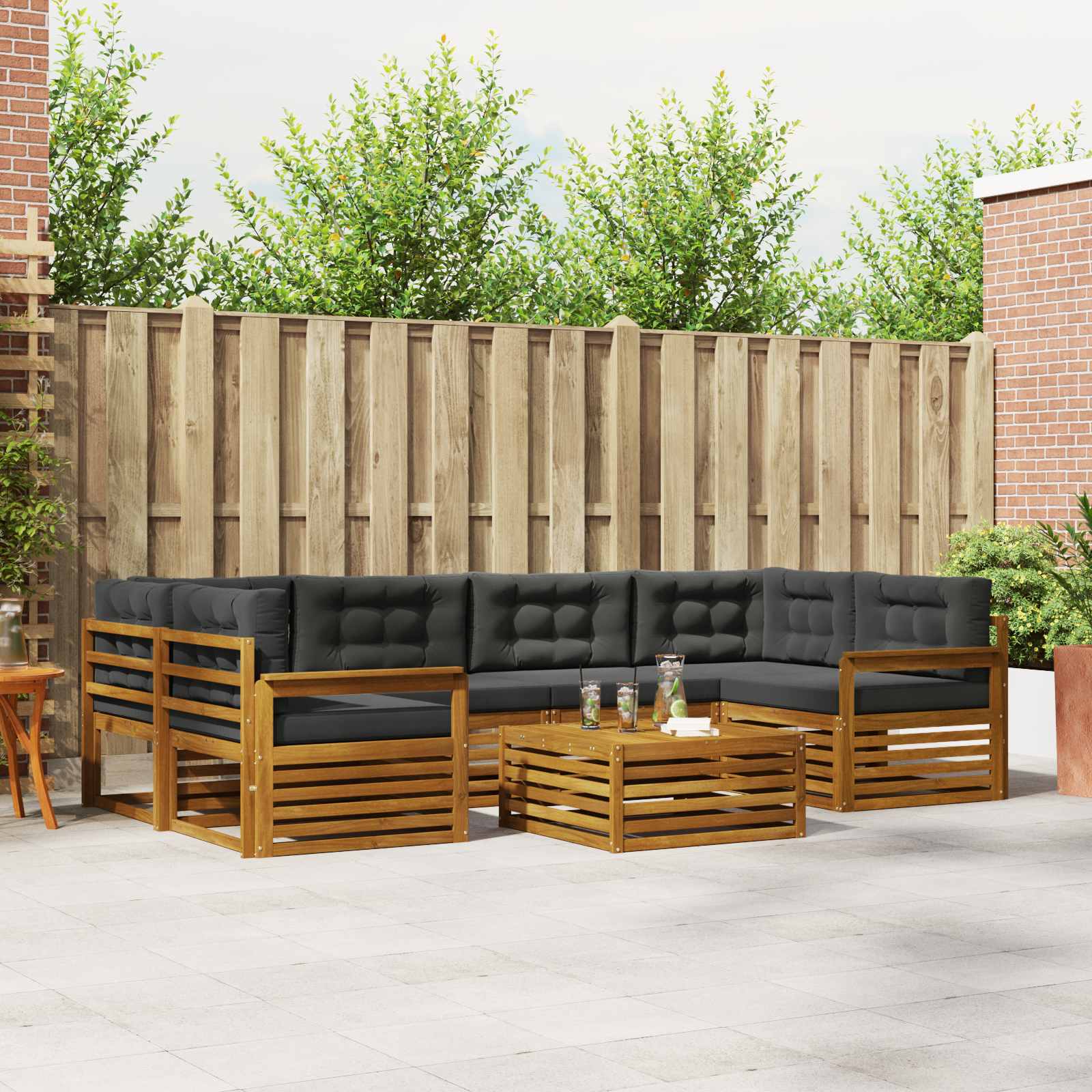 Das Outdoor-Möbelset kombiniert Style und Funktion und wird zum Hingucker für jeden Garten oder jede Terrasse. Das moderne Design mit klaren Linien und minimalistischen Details bringt Eleganz und sorgt dafür, dass du draußen entspannt und gesellig sein kannst. Voll aus massivem Akazienholz, bietet das Set Langlebigkeit und sieht auch nach langer Nutzung toll aus – die ideale Wahl für alle, die praktische und stylische Outdoor-Möbel suchen. Langlebiges massives Akazienholz: Hergestellt aus solidem Akazienholz, ist dieses Outdoor-Möbelset bekannt für Robustheit und Wetterbeständigkeit. Die stabile Konstruktion bietet dir zuverlässigen Halt und lange Stabilität, während die warme Farbe jeden Garten oder jede Terrasse aufwertet. Wetterbeständiges Design: Dieses Set hat eine lackierte Oberfläche, die zusätzlichen Schutz gegen Sonne, leichten Regen und andere Wetterbedingungen bietet. Der polierte Look hilft, sowohl das Aussehen als auch die Funktionalität zu wahren, damit du langfristig Freude daran hast. Komponenten & Design: Jedes Stück, von Armlehnen bis Rückenlehnen, ist für Style und Funktionalität gemacht. Unterstützende Features sorgen für extra Komfort, während das harmonische Design ein angenehm zusammenpassendes Ensemble für verschiedene Outdoor-Anlässe bietet. Komfort & Vielseitigkeit: Das modulare Design lässt dir viel Spielraum für die Anordnung, so dass es flexibler für verschiedene Räume und Bedürfnisse ist. Ob zum Entspannen, für gesellige Zusammenkünfte oder ruhige Lesemomente, dieses Set passt sich problemlos deiner Außenumgebung an und bietet maximalen Komfort. Einfache Pflege & Wartung: Halte die Möbel in Top-Zustand, indem du die Oberfläche mit einem feuchten Tuch reinigst und scharfe Reiniger meidest. Regelmäßige Pflege erhält das schöne Aussehen und die Lebensdauer der Möbel.