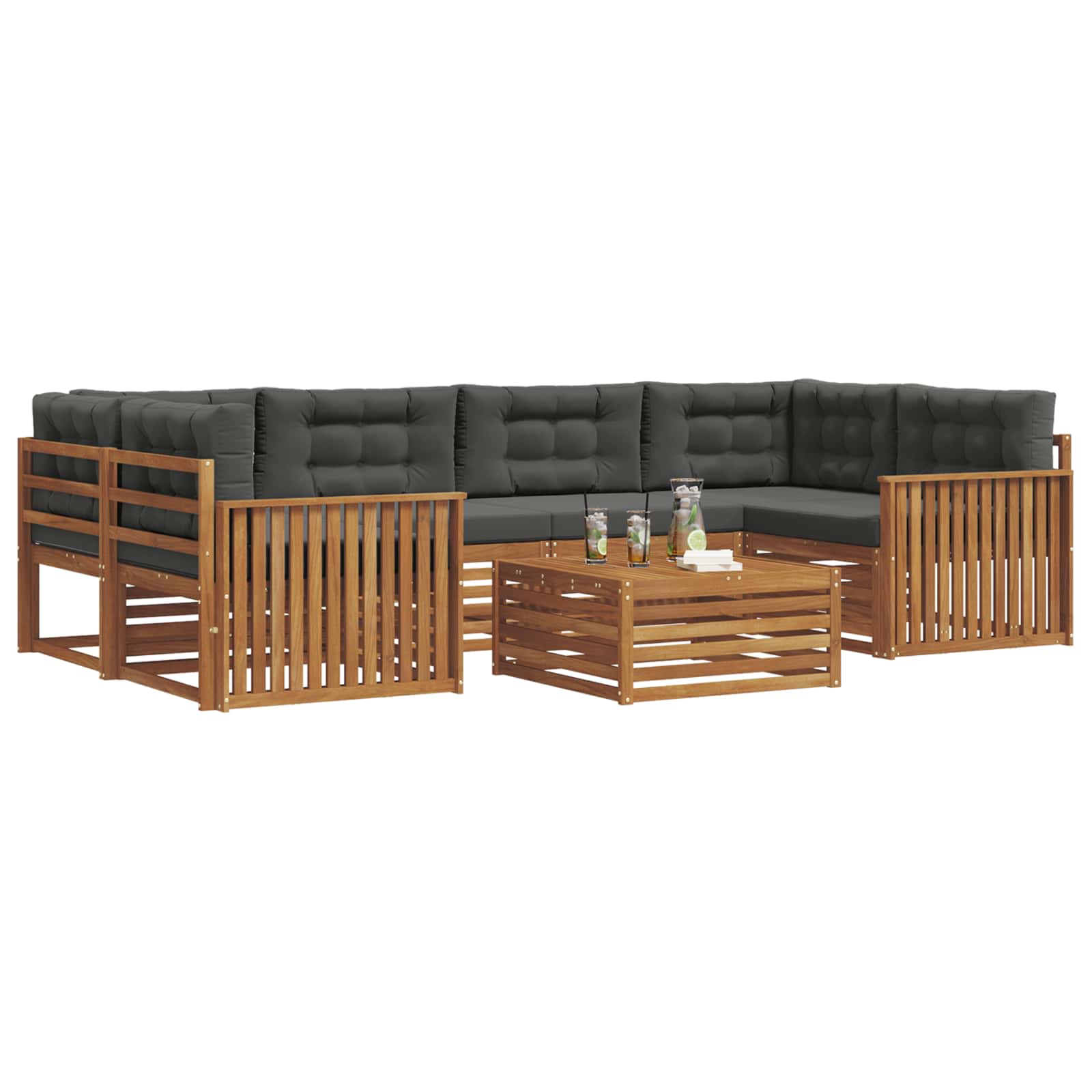 Das Outdoor-Möbelset kombiniert Style und Funktion und wird zum Hingucker für jeden Garten oder jede Terrasse. Das moderne Design mit klaren Linien und minimalistischen Details bringt Eleganz und sorgt dafür, dass du draußen entspannt und gesellig sein kannst. Voll aus massivem Akazienholz, bietet das Set Langlebigkeit und sieht auch nach langer Nutzung toll aus – die ideale Wahl für alle, die praktische und stylische Outdoor-Möbel suchen. Langlebiges massives Akazienholz: Hergestellt aus solidem Akazienholz, ist dieses Outdoor-Möbelset bekannt für Robustheit und Wetterbeständigkeit. Die stabile Konstruktion bietet dir zuverlässigen Halt und lange Stabilität, während die warme Farbe jeden Garten oder jede Terrasse aufwertet. Wetterbeständiges Design: Dieses Set hat eine lackierte Oberfläche, die zusätzlichen Schutz gegen Sonne, leichten Regen und andere Wetterbedingungen bietet. Der polierte Look hilft, sowohl das Aussehen als auch die Funktionalität zu wahren, damit du langfristig Freude daran hast. Komponenten & Design: Jedes Stück, von Armlehnen bis Rückenlehnen, ist für Style und Funktionalität gemacht. Unterstützende Features sorgen für extra Komfort, während das harmonische Design ein angenehm zusammenpassendes Ensemble für verschiedene Outdoor-Anlässe bietet. Komfort & Vielseitigkeit: Das modulare Design lässt dir viel Spielraum für die Anordnung, so dass es flexibler für verschiedene Räume und Bedürfnisse ist. Ob zum Entspannen, für gesellige Zusammenkünfte oder ruhige Lesemomente, dieses Set passt sich problemlos deiner Außenumgebung an und bietet maximalen Komfort. Einfache Pflege & Wartung: Halte die Möbel in Top-Zustand, indem du die Oberfläche mit einem feuchten Tuch reinigst und scharfe Reiniger meidest. Regelmäßige Pflege erhält das schöne Aussehen und die Lebensdauer der Möbel.