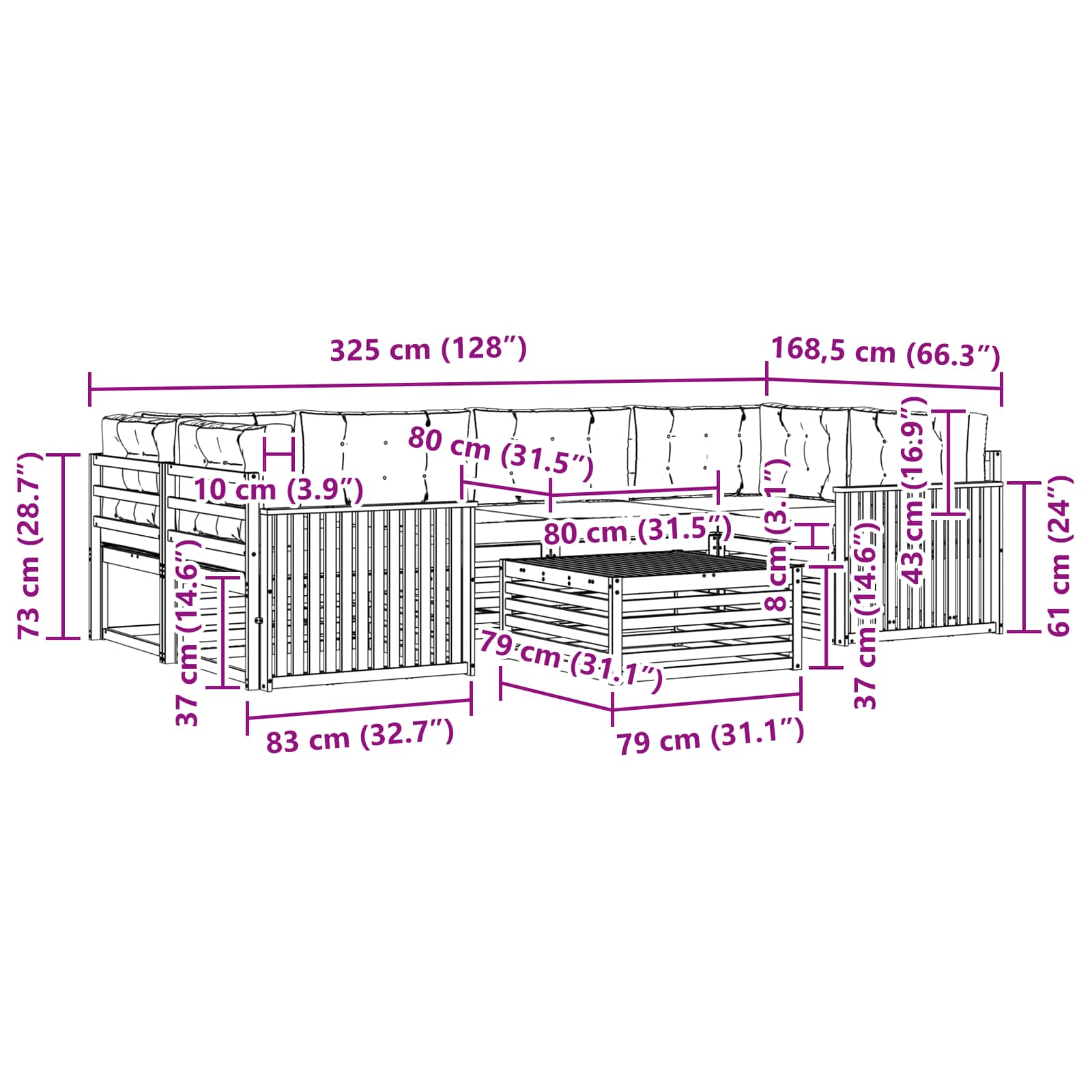 - 8 x Rückenpolster: 80 x 43 x 10 cm (LxBxH)
