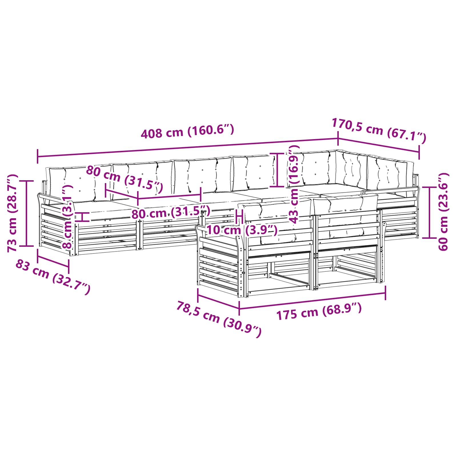 - 8 x Sitzkissen: 80 x 80 x 8 cm (LxBxH)