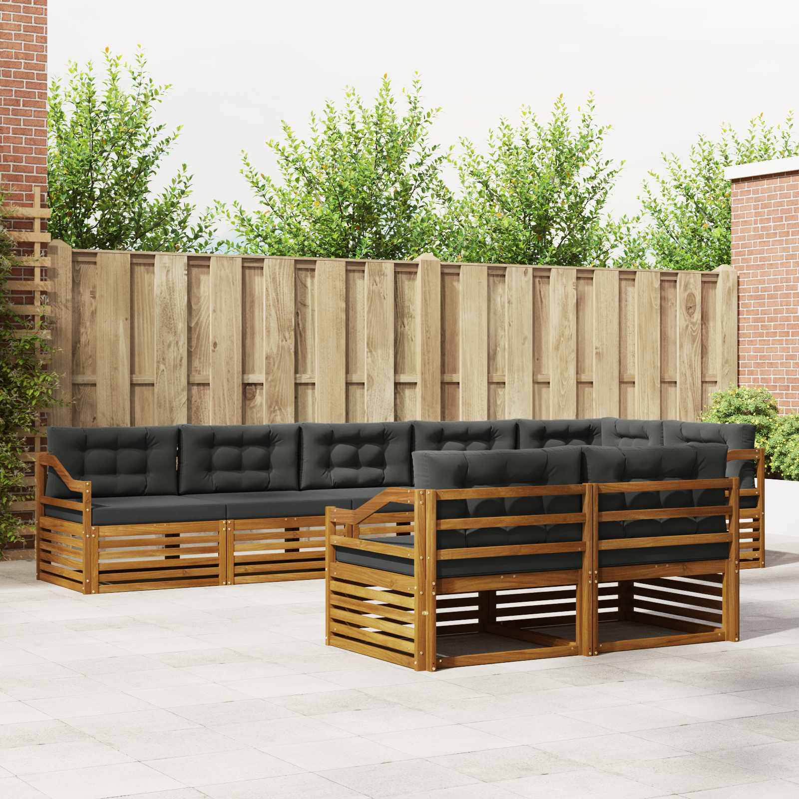 Dieses Outdoor-Sofa-Set vereint moderne Eleganz mit praktischem Komfort und passt super in jeden Garten oder auf jede Terrasse. Die schlichte und klare Ästhetik wird durch den minimalistischen Stil und den warmen Farbton des massiven Akazienholzes geprägt. Ideal zum Entspannen im Freien – es kombiniert Langlebigkeit mit der Flexibilität eines modularen Designs, das kreative Anordnungen erlaubt, ob für Entspannung, Unterhaltung oder lockere Gespräche. Jedes Element wertet das Gartenambiente auf und schafft eine einladende Atmosphäre für Zusammenkünfte oder für ruhige Momente ganz für sich. Massive Materialien: Das Sofaset besteht komplett aus solidem Akazienholz und bietet eine stabile, langlebige Grundlage für den Außenbereich. Die natürliche Maserung und warmen Brauntöne sorgen für einen schönen, harmonischen Look. Diese Materialwahl steht für Zuverlässigkeit und Haltbarkeit, denn Akazie hält der Witterung stand und sieht auch nach Jahren noch gut aus. Funktion und Design: Mit dem modularen Rahmen kannst du das Sofa nach deinen Räumen und Sitzbedürfnissen umstellen. Der Lattenrücken sorgt für eine bequeme Lehne und gute Luftzirkulation, was an heißen Tagen besonders wichtig ist. Ergonomische Armlehnen bieten zusätzlichen Komfort für längere Aufenthalte. Vielseitige Komponenten: Dank des stabilen Lattenrahmens ist dieses Stück auch bei häufigem Gebrauch beständig und lädt zum Entspannen ein. Die warmen braunen Arm- und Rückenlehnen ergänzen die robuste Struktur perfekt und bringen Stil und Komfort zusammen. Ideal für sonnige Gärten und lebendige Terrassen. Moderne Anpassungsfähigkeit: Stilvoll und minimalistisch, zeigt sich das Sofa-Set in einem modernen Design mit klaren Linien. Perfekt für zeitgenössische Außenbereiche, erfüllt es funktionale und stilvolle Ansprüche und schafft eine entspannende Atmosphäre, die man mit Freunden teilen oder allein genießen kann. Einfache Pflege: Um das schöne Aussehen zu bewahren, reicht es, es mit einem feuchten Tuch abzuwischen. Diese einfache Pflege sorgt dafür, dass das Sofa-Set immer attraktiv aussieht, auch wenn viel Betrieb herrscht oder sich die Jahreszeiten ändern.