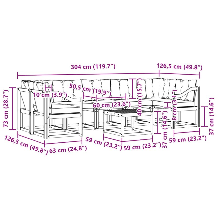 - 9 x Rückenkissen: 60 x 40 x 10 cm (LxBxH)