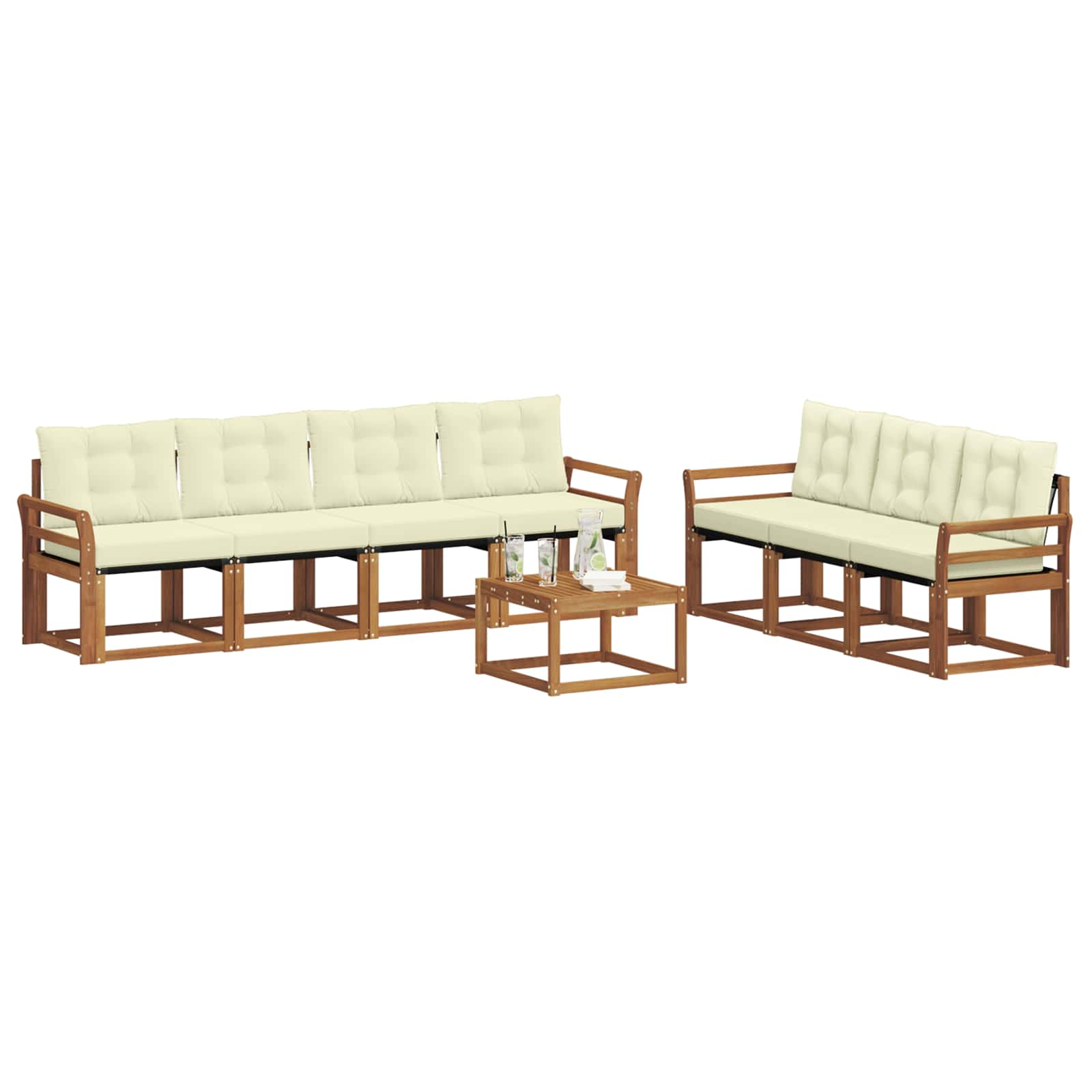 Das Gartenmöbel-Set vereint Stil und Funktion, sodass es in jedem Garten oder auf jeder Terrasse zum Blickfang wird. Mit seinem klaren Design und der Liebe zum Minimalismus verleiht es Eleganz und schafft eine entspannte Atmosphäre für draußen sowie gesellige Runden. Voll aus massivem Akazienholz gefertigt, sorgt es für Langlebigkeit und einen nachhaltigen Blickfang – die perfekte Wahl für alle, die praktische und coole Gartenmöbel suchen. Haltbares Akazienholz: Das Gartenmöbel-Set aus massivem Akazienholz ist langlebig und widerstandsfähig. Die stabile Konstruktion sorgt für zuverlässige Unterstützung und langfristige Stabilität, und der warme natürliche Farbton bringt jeden Garten oder jede Terrasse zum Strahlen. Wetterfestes Design: Dank der lackierten Oberfläche bietet dieses Set Schutz gegen Sonne, leichten Regen und andere Witterungen. Das polierte Finish sorgt dafür, dass das Set gut aussieht und lange hält, perfekt für deinen Garten, deine Terrasse oder deinen Hof. Design & Komponenten: Jedes Teil, von den Armlehnen bis zu den Rückenlehnen, sieht gut aus und ist praktisch. Unterstützende Features bieten zusätzlichen Komfort, während das harmonische Design eine optische Einheit für verschiedene Outdoor-Anlässe schafft. Komfort & Flexibilität: Das modulare Design passt sich den unterschiedlichen Raum- und Nutzungsbedürfnissen an. Perfekt zum Entspannen, Feiern oder gemütlichem Lesen – das Set fügt sich leicht in jede Außenumgebung ein und sorgt für maximalen Komfort. Einfache Pflege: Halte die Möbel in Top-Zustand, indem du sie mit einem feuchten Tuch abwischst und aggressive Reinigungsmittel vermeidest. Regelmäßige Pflege sorgt dafür, dass sie hübsch bleiben und lange durchhalten.