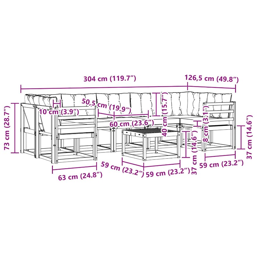 - 9 x Rückenkissen: 60 x 40 x 10 cm (LxBxH)