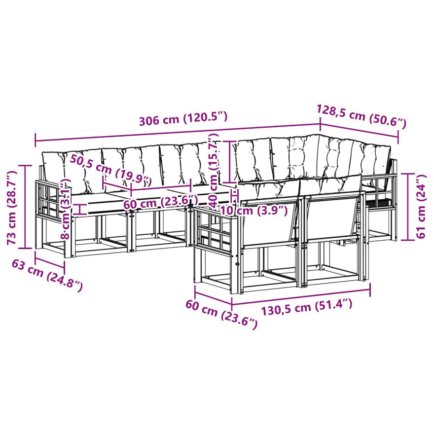 - 7 x Sitzkissen: 60 x 50,5 x 8 cm (LxBxH)