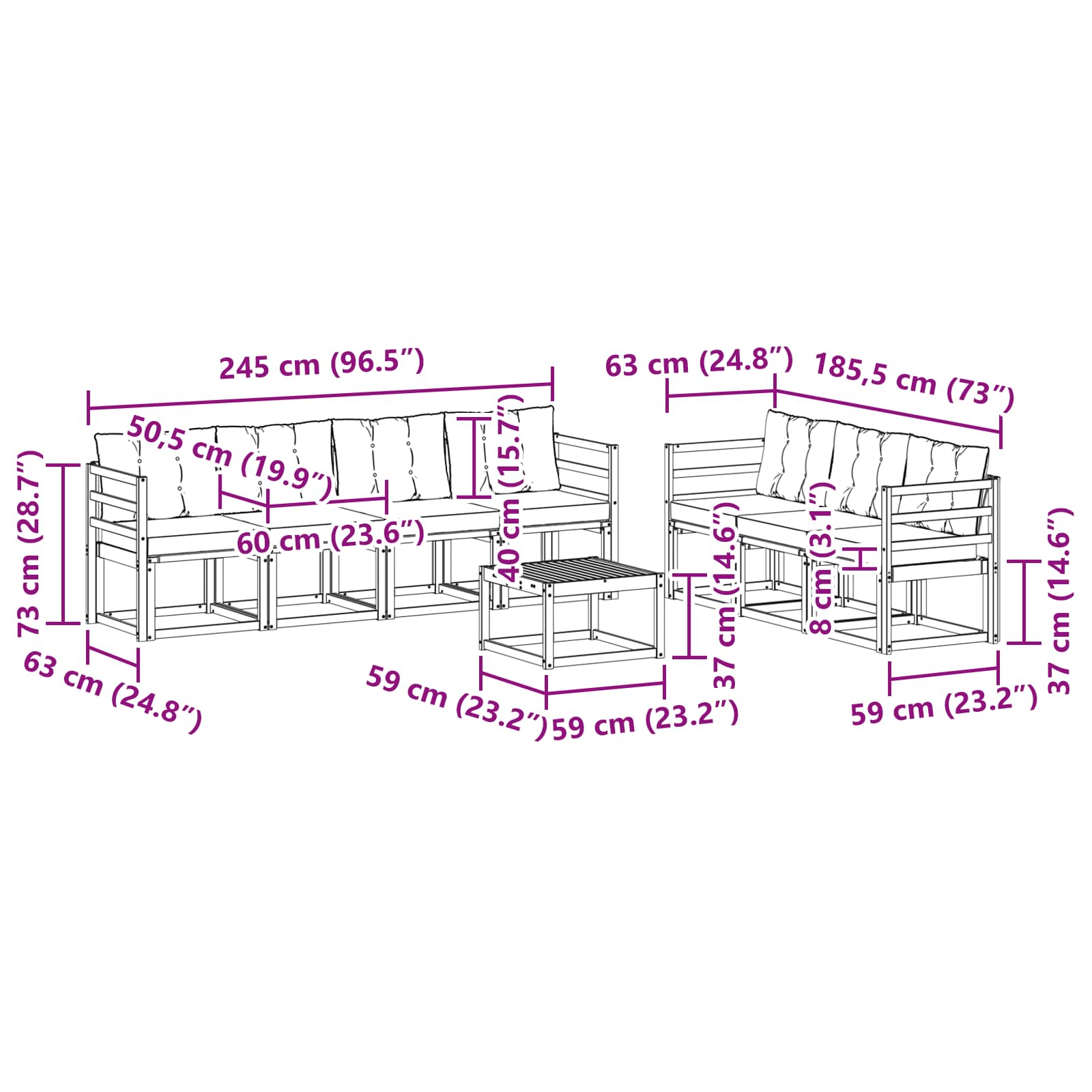 - 7 x Mittelsofa: 59 x 63 x 73 cm (LxBxH)