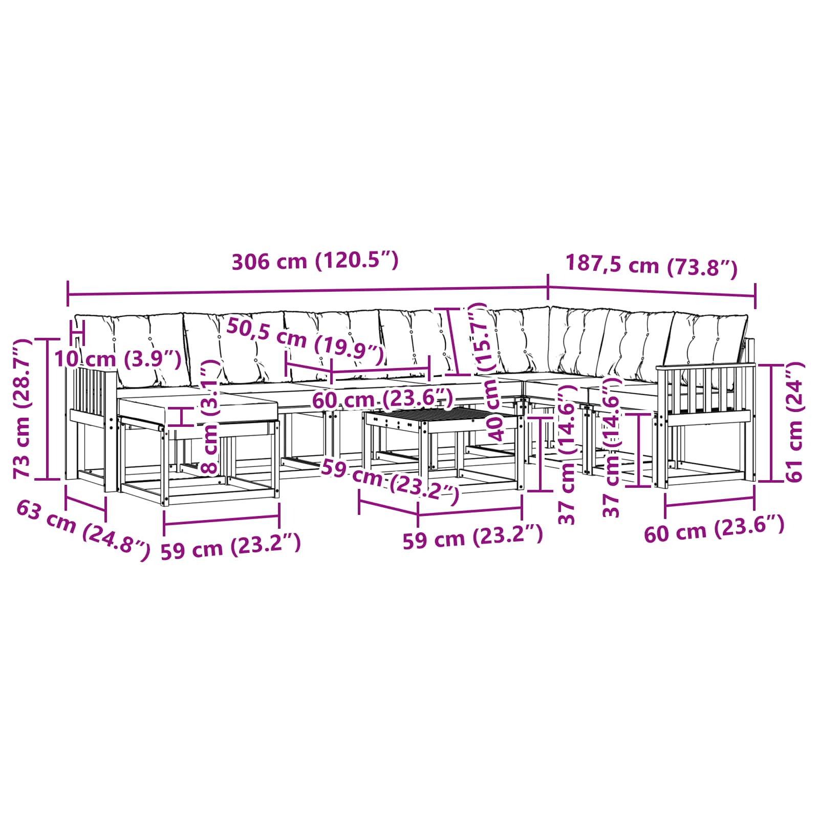 - 8 x Rückenpolster: 60 x 40 x 10 cm (LxBxH)