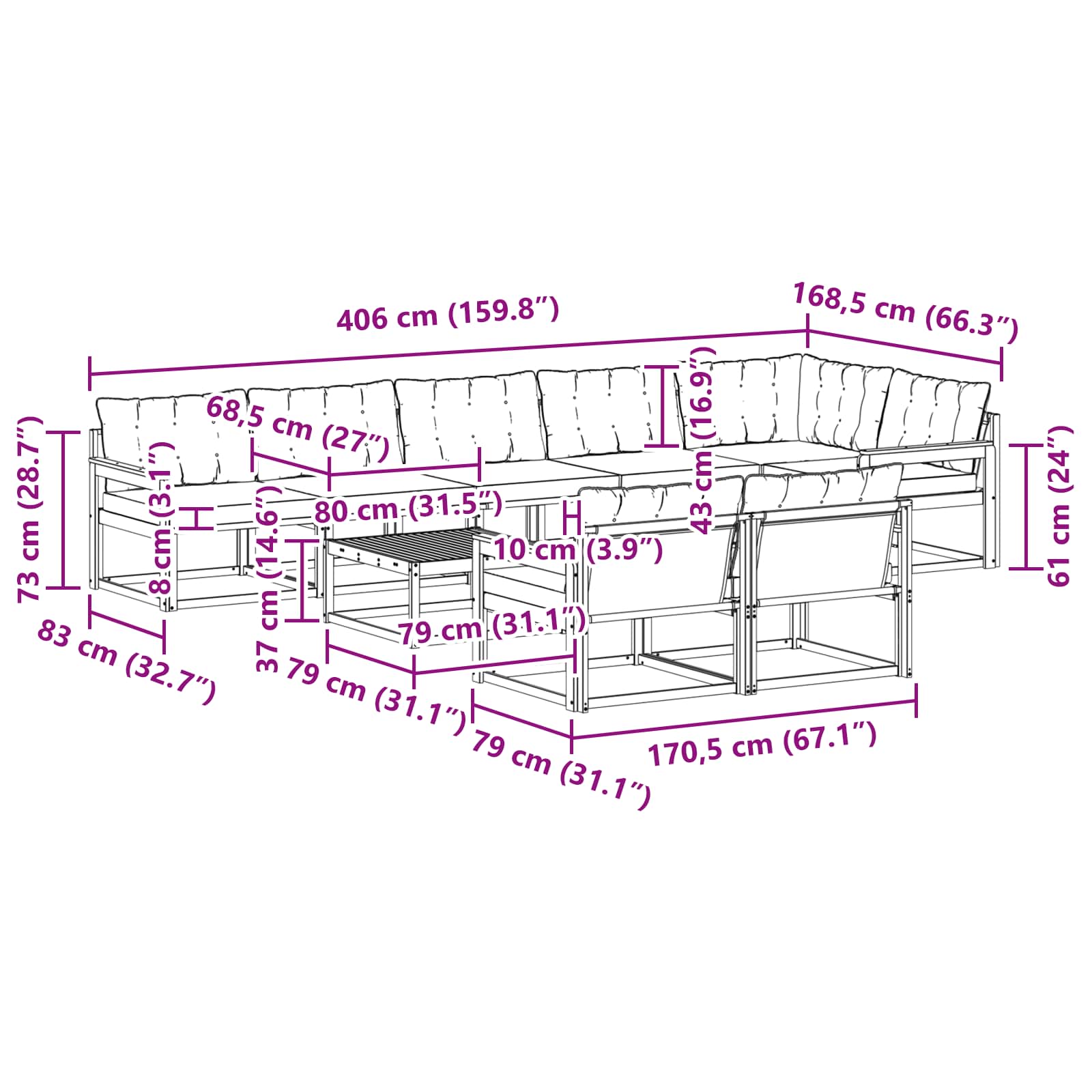 - 7 x Sitzkissen: 80 x 68,5 x 8 cm (LxBxH)