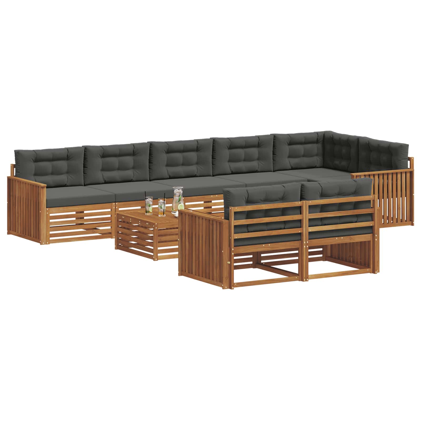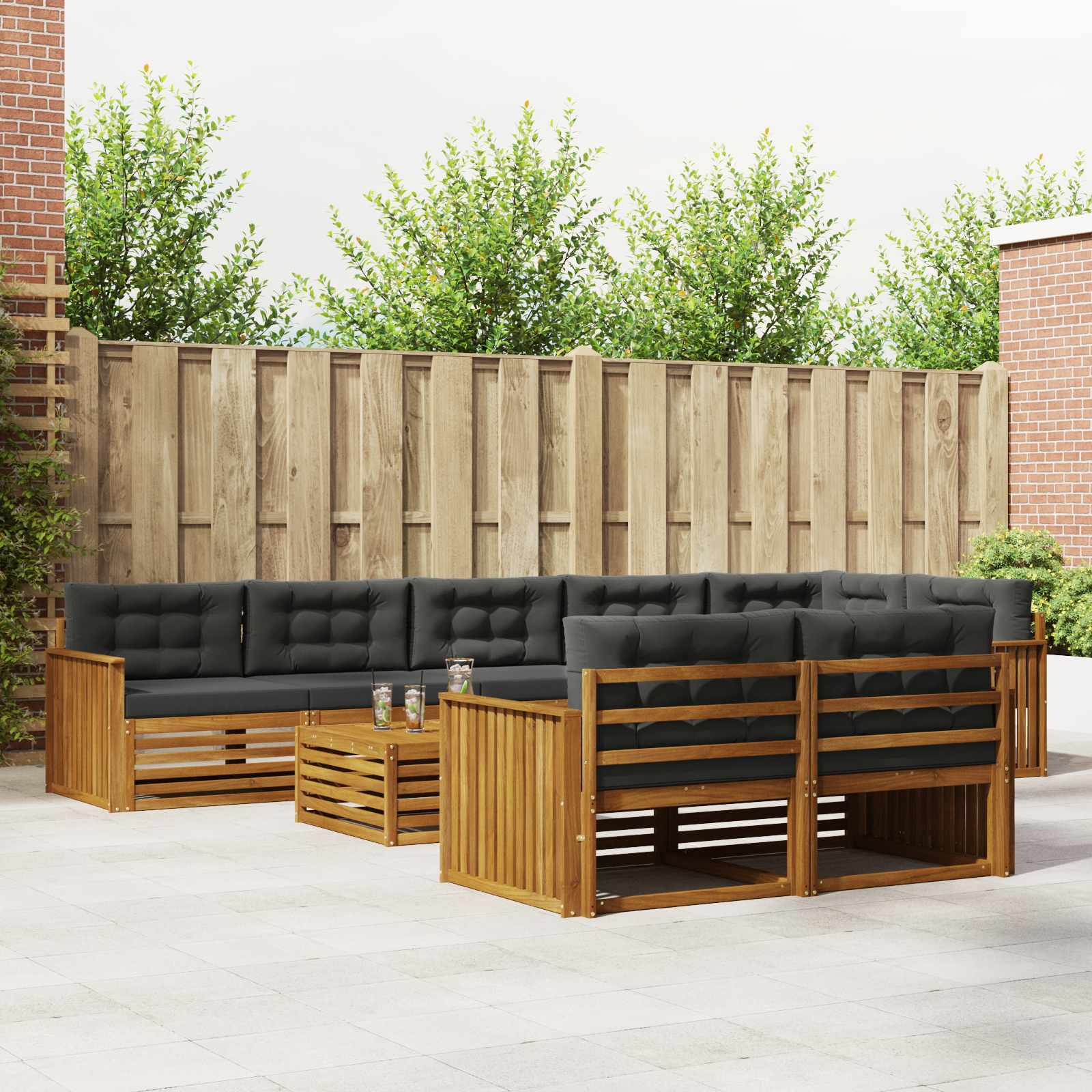 Das Gartenmöbelset bietet Style und Funktionalität und wird zum absoluten Highlight für jeden Garten oder jede Terrasse. Das moderne Design mit klaren Linien und minimaler Gestaltung bringt Eleganz und macht das Entspannen im Freien sowie gesellige Zusammenkünfte noch angenehmer. Ganz aus massivem Akazienholz gefertigt, bietet das Set nicht nur Langlebigkeit, sondern sieht auch mega gut aus. Die perfekte Wahl für alle, die praktische und schicke Möbel wollen. Langlebiges Massivholz Akazie: Dieses Gartenmöbelset aus solidem Akazienholz ist bekannt für seine Widerstandsfähigkeit und Langlebigkeit bei Outdoor-Verhältnissen. Die robuste Bauweise sorgt für jederzeit eine stabile Basis, während der warme Holzton jeden Garten oder jede Terrasse verschönert. Wetterfestes Design: Mit einer lackierten Oberfläche bietet dieses Gartenmöbelset zusätzlichen Schutz gegen Sonne, leichten Regen und andere Wetterbedingungen. Der polierte Look hilft, sowohl die Optik als auch die Funktionalität zu erhalten und macht es perfekt für deinen Garten, die Terrasse oder den Hinterhof. Komponenten & Design: Jedes Teil, von den Armlehnen zu den Rückenlehnen, ist stilvoll und funktional gestaltet. Die stützenden Details bieten zusätzlichen Komfort, während das harmonische Design ein ansprechendes Gesamtbild für verschiedene Outdoor-Anlässe schafft. Komfort & Vielseitigkeit: Das modulare Design erlaubt individuelle Konfigurationen, die auf verschiedene Räume und Bedürfnisse abgestimmt werden können. Ideal zum Entspannen, für gesellige Treffen oder ruhige Lesemomente, passt sich dieses Set problemlos jeder Outdoor-Umgebung an und maximiert den Komfort. Einfache Pflege & Wartung: Um die Möbel in Schuss zu halten, wische die Oberfläche einfach mit einem feuchten Tuch ab und vermeide aggressive Reiniger. Regelmäßige Pflege sorgt dafür, dass sie gut aussehen und die Lebensdauer verlängert wird.