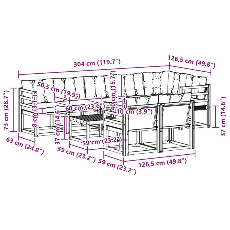 - 7 x Sitzkissen: 60 x 50,5 x 8 cm (LxBxH)
