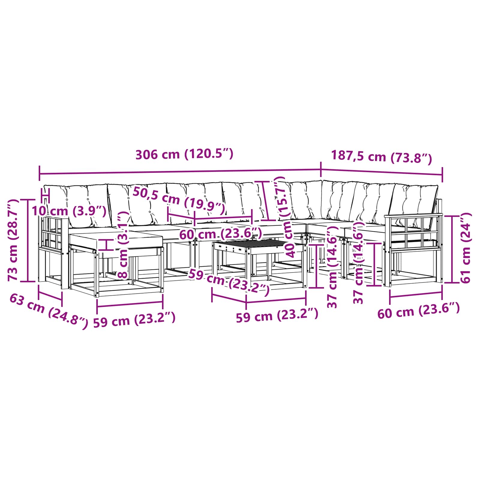 - 8 x Rückenpolster: 60 x 40 x 10 cm (LxBxH)