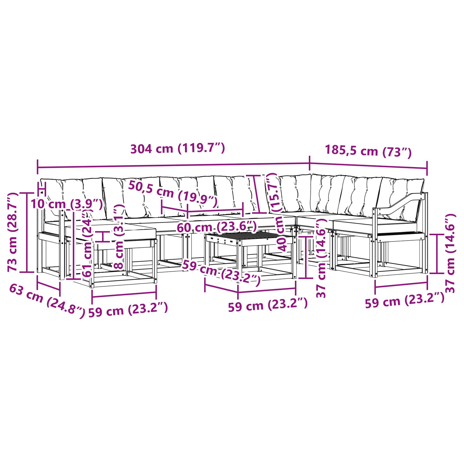 - 8 x Rückenpolster: 60 x 40 x 10 cm (LxBxH)