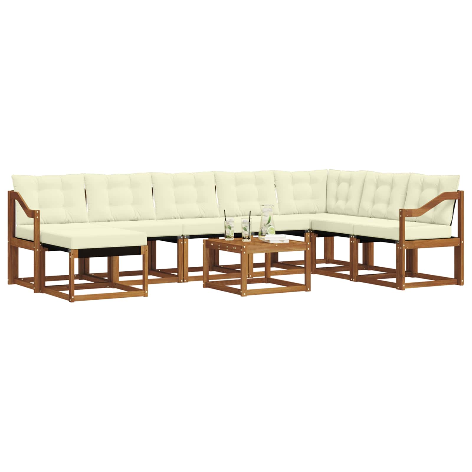Dieses moderne Sofaset bringt sowohl Stil als auch Funktionalität in jeden Außenbereich. Mit klaren, schlichten Linien wirkt es sehr elegant und passt perfekt in zeitgenössische Gärten. Ideal für Terassen und entspannte Poolpartys, bietet es bequeme Sitzplätze und einen stabilen Rahmen, um gemütliche Nachmittage und fröhliche Abende zu genießen. Massivholz-Akazienrahmen Das Set besteht aus langlebigem Akazienholz, das für seine Stärke bekannt ist und super aussieht. Dieses Holz gibt jedem Außenbereich einen warmen, einladenden Look und ist gleichzeitig robust und wetterfest. Textilene-Komfort Mit einer Textilene-Sitzfläche sorgt das Sofaset für extra Komfort. Textilene ist UV-beständig, behält seine Farbe und Textur auch bei Sonnenschein. Perfekt für Gartenmöbel, weil es sowohl praktisch als auch schick ist. Wetterfeste Kissen Die dick gepolsterten Kissen aus wetterfestem Stoff bieten optimalen Komfort. Die Kissen sind feuchtigkeitsabweisend und haben Reißverschlüsse für einfache Reinigung, was die Pflege echt unkompliziert macht. Praktische Armlehnen Die stabilen Armlehnen aus Akazienholz unterstützen eine entspannte Haltung. Sie sehen nicht nur gut aus, sondern bieten auch guten Halt, was das Sitzen angenehm macht. Leicht zu reinigende Oberflächen Das Sofaset benötigt wenig Pflege; einfach mit einem feuchten Tuch abwischen. So bleibt es so ansprechend wie am ersten Tag, damit du mehr Zeit mit entspannen verbringen kannst.