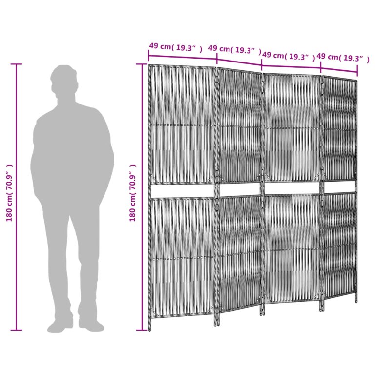 Dekoriere dein Zuhause und teile deinen Raum mit diesem Paravent aus Poly Rattan auf Langlebig und pflegeleicht: Der Paravent ist aus Poly Rattan gefertigt, das nicht nur wetterbeständig und langlebig ist, sondern sich auch einfach reinigen lässt.Robust: Die pulverbeschichtete Stahlrahmen sorgen für Robustheit und Stabilität.Flexibles Faltdesign: Die Paneele sind mit verzinkten Scharnieren miteinander verbunden, sodass sich der Paravent bei Bedarf platzsparend zusammenfalten lässt.Linien-Webdesign: Mit seinem Linien-Webdesign eignet sich dieser Paravent ideal, um zusätzliche Privatsphäre auf stilvolle und künstlerische Weise zu schaffen und gleichzeitig für ausreichende Belüftung und Licht im Raum zu sorgen.Vielseitig einsetzbar: Der Raumteiler eignet sich ideal, um einen privaten Bereich im Innen- und Außenbereich wie im Schlafzimmer, Wohnzimmer oder Büro zu schaffen. Du kannst ihn auch vor ein Fenster stellen, um starkes Sonnenlicht abzublenden. Wichtiger Hinweis:Um sie vollständig flach zu falten, müssen Sie die verzinkten Scharniere demontieren.
