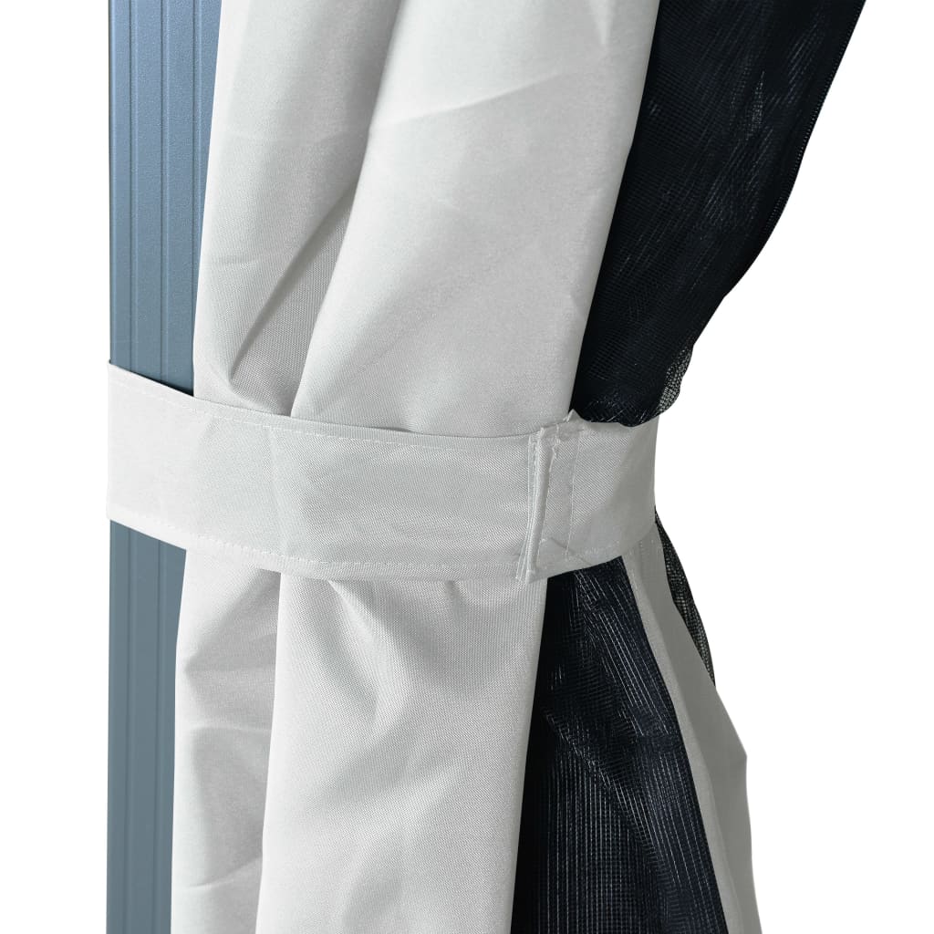 Dieser Pavillon mit Vorhängen hat ein klassisches, elegantes Design. Er wird der perfekte Sonnenschutz für Veranstaltungen im Freien sein, wie zum Beispiel Abendessen, Grillpartys, Familienfeiern usw. Das Dach aus Oxford-Stoff mit PA-Lackierung schützt Sie vor blendendes Licht und schädlichen UV-Strahlen. Der Pavillon besitzt eine solide Konstruktion aus starkem Aluminium und Stahl und ist dadurch rostbeständig und sehr stabil. Zudem wird der Pavillon mit 4 Seitenteilen geliefert, die bei schlechtem Wetter nach unten gezogen werden können. Netzfenster sind ebenfalls dabei, um Insekten fernzuhalten und gleichzeitig eine gute Luftzirkulation zu gewährleisten. Die mitgelieferten Klettverschlüsse sorgen für eine einfache Befestigung. Darüber hinaus schafft die Lichterkette eine gemütliche Atmosphäre im Garten bei Sonnenuntergang. Die Leuchten sind umweltfreundlich, da sie tagsüber durch Sonnenenergie aufgeladen werden. Der Pavillon lässt sich mit den mitgelieferten Befestigungsmaterialien leicht am Boden befestigen. HINWEIS: Dieses Produkt sollte NIEMALS bei schlechtem Wetter wie starkem Wind, starkem Regen, Schnee, Sturm usw. verwendet werden.