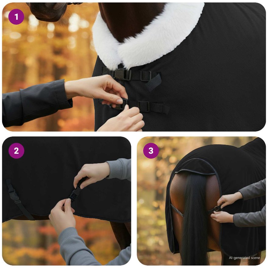 Diese Pferdedecke wurde so gemacht, dass sie bei kaltem Wetter Wärme und Schutz bietet. Ihr modernes Design mit klaren Linien und weniger Schnickschnack verbindet Funktionalität und gutes Aussehen. Ob an kalten Wintertagen oder nach einem langen Arbeitstag, dein Pferd bleibt in dieser Fleece-Decke bequem und warm. Das praktische Design macht sie vielseitig einsetzbar und sorgt dafür, dass sie für Wärme und Stil sorgt. Qualität Polarfleece: Hergestellt aus hochwertigem Polarfleece, bietet diese Decke warme und weiche Vorteile. Das Fleece ist leicht und erlaubt deinem Pferd, sich frei zu bewegen. Selbst an den kältesten Mittwintertagen bleibt es warm, perfekt für draußen. Funktionale Schnallen: Verstellbare Schnallen sorgen für einen perfekten Sitz, der sich jeder Pferdegröße anpasst. Der enge Sitz sorgt für Sicherheit und Komfort, sodass die Decke nicht verrutscht, egal wie dein Pferd sich bewegt. Das gibt dir ein sicheres Gefühl, wenn dein Pferd draußen ist. Vielseitiges Bezugdesign: Mit einem abnehmbaren Bezug ist die Decke easy zu reinigen. Der Bezug lässt sich einfach abnehmen und bei 30 Grad waschen, damit er frisch bleibt. So hast du mehr Zeit für dein Pferd und weniger Aufwand für die Reinigung. Wettergeschützte Ausführung: Dank des winddichten Designs schützt die Decke vor schlechtem Wetter. Sie hält windigen Bedingungen stand und sorgt dafür, dass dein Pferd sich gut fühlt und geschützt bleibt. Diese Haltbarkeit garantiert, dass die Decke den ganzen Winter für dich da ist. Praktisches Aufbewahrungsmerkmal: Das zusammenklappbare Design ist perfekt, um die Decke platzsparend zu verstauen, wenn du sie nicht brauchst. Sie lässt sich schnell zusammenfalten und nimmt wenig Platz weg. Dieses Feature ist super für kleine Räume, damit die Decke immer bereit ist, wenn es kalt wird.
