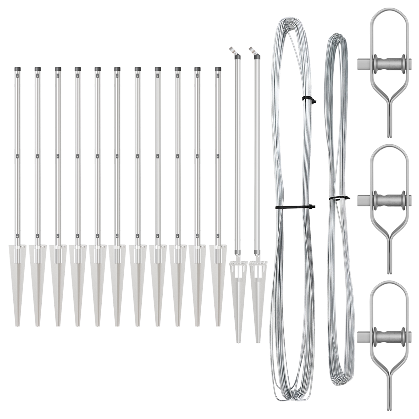 - Lieferumfang: 11 x Pfosten, 2 x Winkelpfosten, 11 x Spike, 2 x Winkelspike, 11 x Plastikkappe, 33 x Plastik-Spannungsdrahtstützen, 33 x Schraube am Plastiksupporter, 2 x Winkelpfostenkappen, 2 x Winkelpfostenhardware, 3 x Spannungsregler, 1 x 25m Bindedraht, 1 x 80m Spannungsdraht