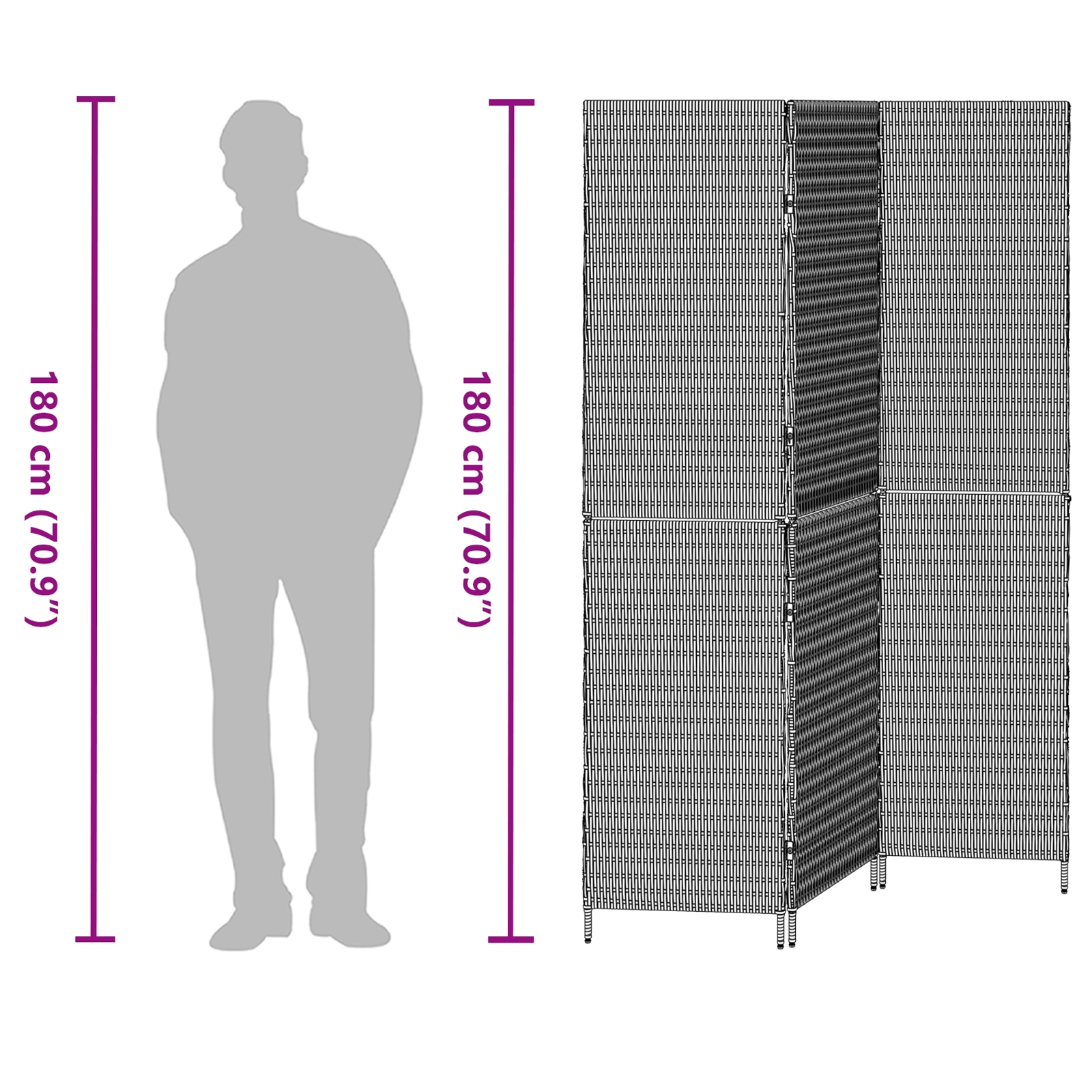 Dieser 3-Panel Faltbare Sichtschutz ist die perfekte Kombination aus Stil und Funktion. Er ist ideal, um private Bereiche in Wohnzimmern, Schlafzimmern oder Büros zu schaffen. Das elegante, moderne Design aus texturiertem Polyethylen-Rattan bringt einen frischen Look in dein Zuhause und sorgt für die Privatsphäre, die du brauchst – drinnen oder draußen. Kompakt und faltbar: Der Raumteiler ist einfach zu verstauen und zu transportieren, was ihn super praktisch für alle macht, die flexibel bleiben wollen. Er ist schnell aufgebaut und passt in viele Anwendungen und Umgebungen. Robuste Konstruktion: Aus haltbarem synthetischen Rattan und einem stabilen Stahlrahmen gefertigt, kann dieser Sichtschutz im Alltag gut genutzt werden und bleibt dabei schick. Die matte Oberfläche fügt sich gut in verschiedene Stile ein. Stylisch und funktional: Das clevere Design dieses Trennwand eignet sich nicht nur für Privatsphäre, sondern auch als Blickfang, der Leben in dein Zuhause oder Büro bringt. Es hilft, Räume abzutrennen oder einfach die Gesamtatmosphäre aufzufrischen. Ausreichender Sichtschutz: Mit einer Höhe von 180 cm bietet dieser Screen ausreichend Sichtschutz und ermöglicht gemütliche Ecken, egal ob in einem geschäftigen Büro oder einem entspannten Zuhause. Perfekt, wenn du etwas Privatsphäre brauchst. Einfache Pflege: Die Reinigung ist ein Kinderspiel – einfach mit einem trockenen Tuch abwischen. Halte ihn trocken, um die Qualität über Jahre hinweg zu bewahren.