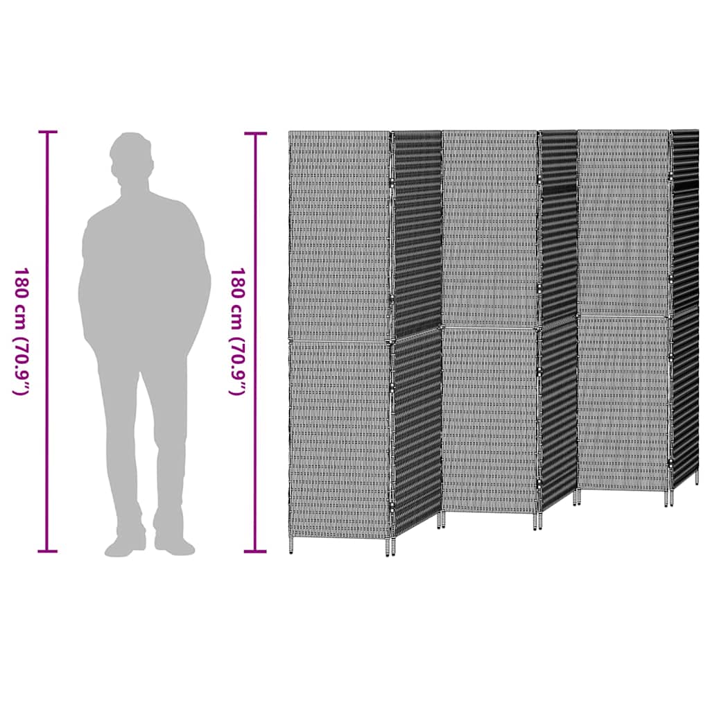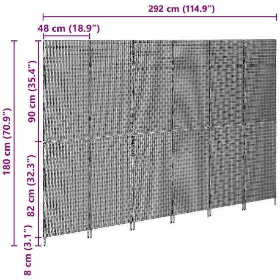Dieser Poly-Rattan Falt-Raumteiler ist die ideale Lösung, um in deinem Zuhause Räume elegant und einfach zu unterteilen. Das moderne Design aus Poly-Rattan bringt einen Hauch von Stil und bleibt dabei funktional und ansprechend. Perfekt für Wohnzimmer, verwandelt er offene Bereiche in gemütliche Rückzugsorte mit seiner schicken rechteckigen Form und der matten Oberfläche. Seine faltbare Konstruktion macht ihn super flexibel – perfekt, wenn du einfach mal umräumen willst. Poly-Rattan Struktur Der Raumteiler ist aus langlebigem Poly-Rattan gefertigt, bietet eine moderne, geflochtene Optik und bleibt dabei UV-beständig. Das Material ist stark und sieht gleichzeitig super aus. So hast du das Feeling von natürlichen Fasern, ohne die Abnutzung, die man normalerweise hat. Faltmechanismus Das faltbare Design macht die Lagerung super easy. Klapp ihn einfach zusammen, wenn du ihn nicht brauchst, perfekt für alle, die flexible Lösungen suchen. So bleibt der Boden schön frei und das macht ihn ideal für kleine Wohnungen. Matte, nicht reflektierende Oberfläche Die matte Oberfläche sorgt für einen schicken Look und vermeidet unangenehmes Blitzen. Diese Eigenschaften fügen eine subtile Eleganz hinzu, wobei er problemlos in jedes moderne Design passt. Manuelle Anpassung Du kannst den Raumteiler manuell anpassen, ganz ohne Werkzeug. Verschiebe die Paneele einfach nach deinen Wünschen. Diese einfache Handhabung macht ihn besonders benutzerfreundlich. Einfache Montage Du kannst ihn mit einem Schraubendreher schnell aufstellen – keine komplizierten Schritte nötig! Ideal, um ihn schnell einsatzbereit zu machen. Der Aufbau ist auch mit zwei Personen total entspannt und braucht keine speziellen Werkzeuge.