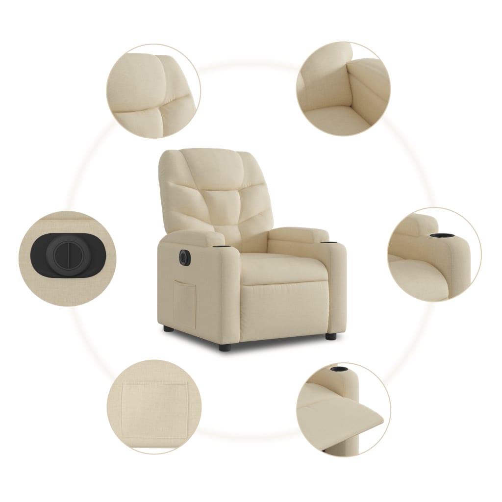 Lehne dich zurück und entspanne dich in diesem äußerst bequemen Fernsehsessel! Elektrische Liegefunktion: Dieser Relaxsessel ist mit einem Elektromotor ausgestattet, der Fußstütze und Rückenlehne durch einfaches Drücken des seitlichen Knopfes automatisch in jede gewünschte Position bringt. Diese Funktion ermöglicht eine maximale Neigung von 135 Grad. Darüber hinaus lässt sich die Rückenlehne auf Knopfdruck automatisch in die ursprünglichen Position zurückbringen.Bequemes Sitzerlebnis: Die dick gepolsterte Sitzfläche, die Rückenlehne und die breiten Armlehnen sorgen für ein behagliches und wohliges Sitzgefühl. Der Bezug aus Stoff weist eine schlichte und saubere Optik auf und ist auch atmungsaktiv und langlebig.Praktische Getränkehalter und Seitentasche: Dieser Sessel verfügt über zwei praktische Becherhalter und eine Seitentasche, in der du wichtige Sachen griffbereit aufbewahren kannst.Solider und stabiler Rahmen: Der Rahmen aus Holz und Metall sorgt für eine solide Struktur und hohe Stabilität. Dieser TV-Sessel ist bequem und langlebig.