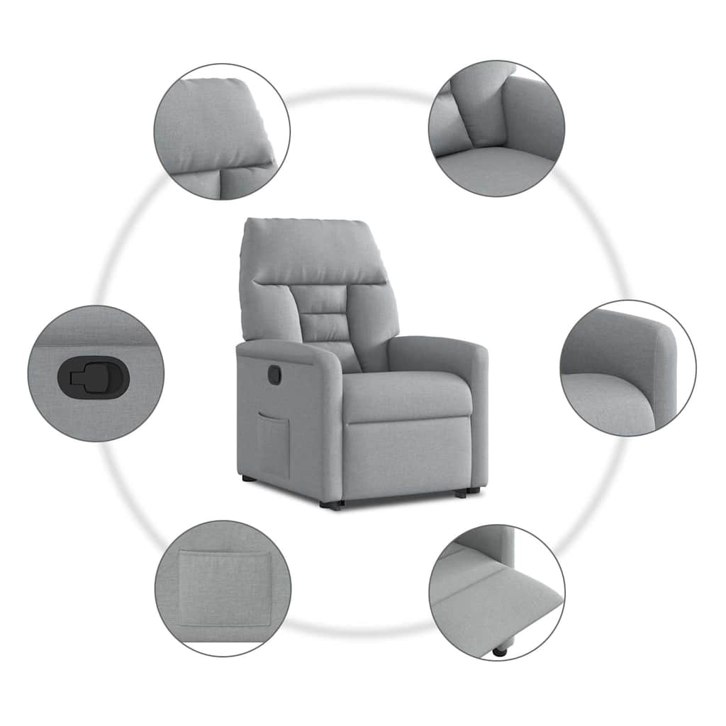 Lehne dich zurück und entspanne dich in diesem äußerst bequemen Relaxsessel mit Aufstehhilfe! Elektrische Aufstehhilfe: Dieser Relaxsessel ist mit einem Elektromotor zum Anheben ausgestattet. Dank der Aufstehhilfe, die den gesamten Sessel nach oben bringt, kannst du ganz einfach auf Knopfdruck aufstehen, ohne deinen Rücken und deine Knie zu belasten.Manuelle Liegefunktion: Dieser Ruhesessel lässt sich mittels des Griffs an der rechten Seite verstellen. So kannst du das Fußteil und die Rückenlehne manuell in jede beliebige Position bringen, um höchsten Komfort zu genießen. Die Rückenlehne lässt sich max. 135 Grad nach hinten verstellen. Durch einfaches Ziehen lässt sie sich schnell wieder in die ursprüngliche Position bringen.Bequemes Sitzerlebnis: Die dick gepolsterte Sitzfläche, die Rückenlehne und die breiten Armlehnen sorgen für ein behagliches und wohliges Sitzgefühl. Der Bezug aus Stoff weist eine schlichte und saubere Optik auf und ist auch atmungsaktiv und langlebig.Praktische Getränkehalter und Seitentasche: Dieser Sessel verfügt über zwei praktische Getränkehalter und eine Seitentasche, in der du deine Fernbedienung oder andere wichtige Sachen griffbereit aufbewahren kannst.Solider und stabiler Rahmen: Der Rahmen aus Holz und Metall sorgt für eine solide Struktur und hohe Stabilität. Dieser TV-Sessel ist bequem und langlebig.