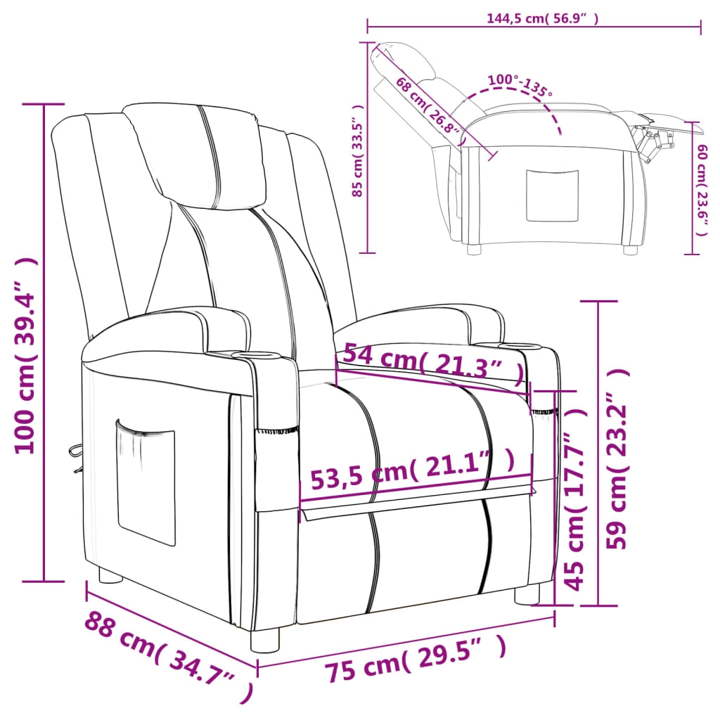 Lehne sich zurück und entspanne sich in diesem äußerst bequemen Relaxsessel! Manuelle Liegefunktion: Der Sessel kann manuell in 3 Positionen verstellt werden, so dass die Rückenlehne und der Fußteil je nach Bedarf eingestellt werden können.Bequemes Sitzerlebnis: Der dick gepolsterte Sitz, die Rückenlehne und die breiten, mit Kunstleder bezogenen Armlehnen sorgen für ein behagliches und angenehmes Sitzgefühl. Künstliches Leder ist ein äußerst langlebiges Material. Es ist schmutzabweisend und lässt sich mit einem feuchten Tuch einfach reinigen. Durch die glatte Oberfläche weist es die luxuriöse Schönheit von Echtleder auf.Solider und stabiler Rahmen: Der Rahmen aus Holz und Metall sorgt für eine solide Struktur und hohe Stabilität. Dieser TV-Sessel ist bequem und langlebig.